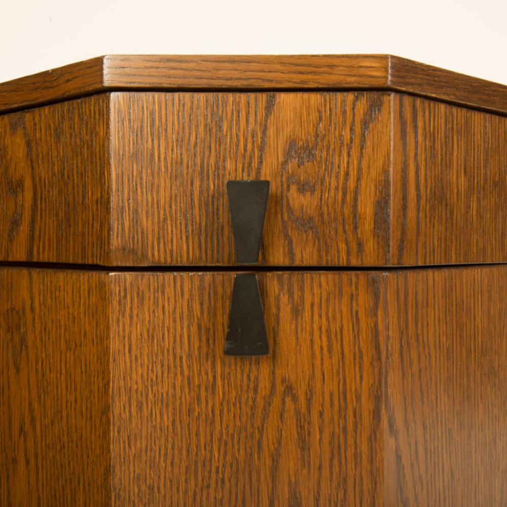 A Mid Century Modern walnut decagon cabinet By Harvey Probber, circa 1950. This item features the original label. The interior features an open storage space with one top drawer.