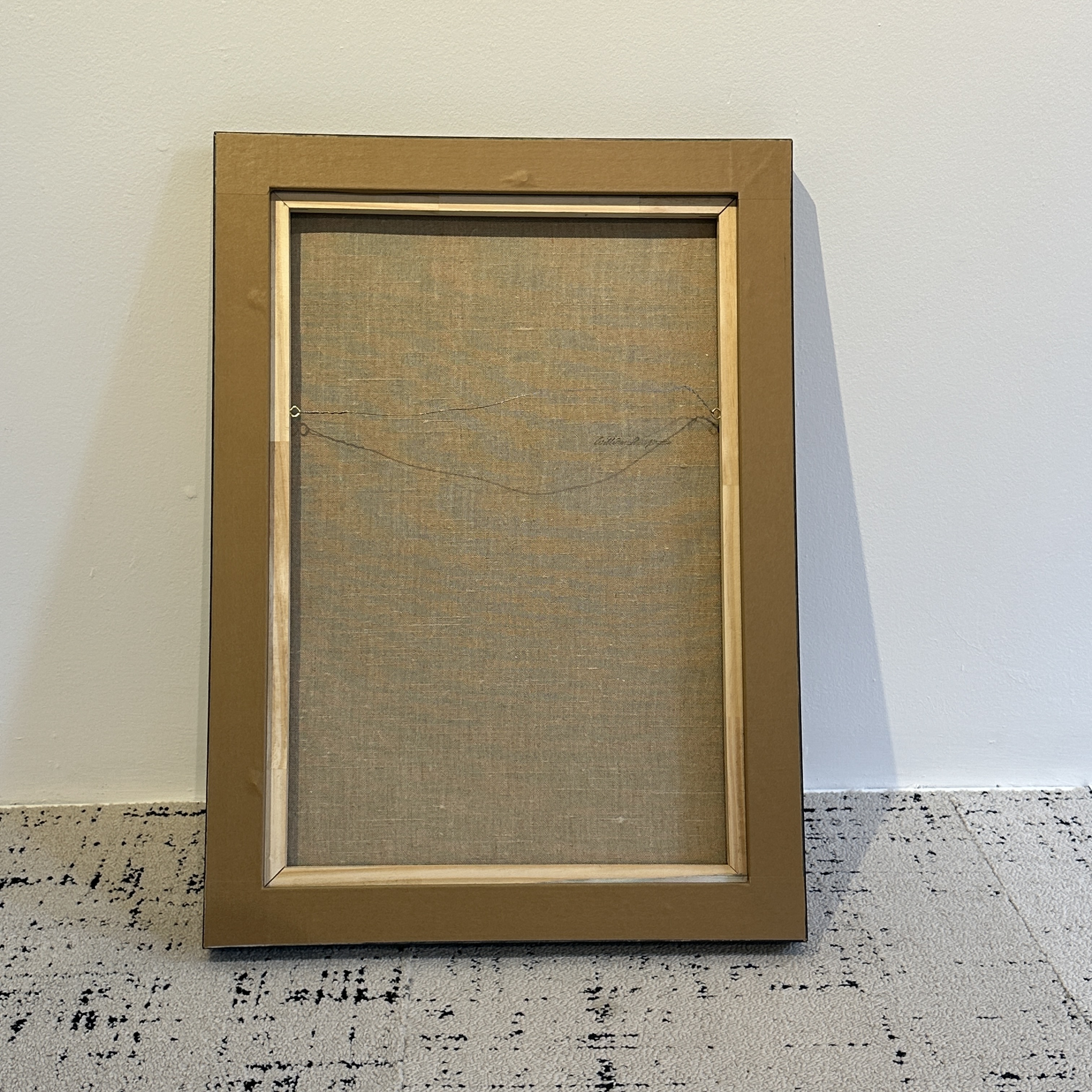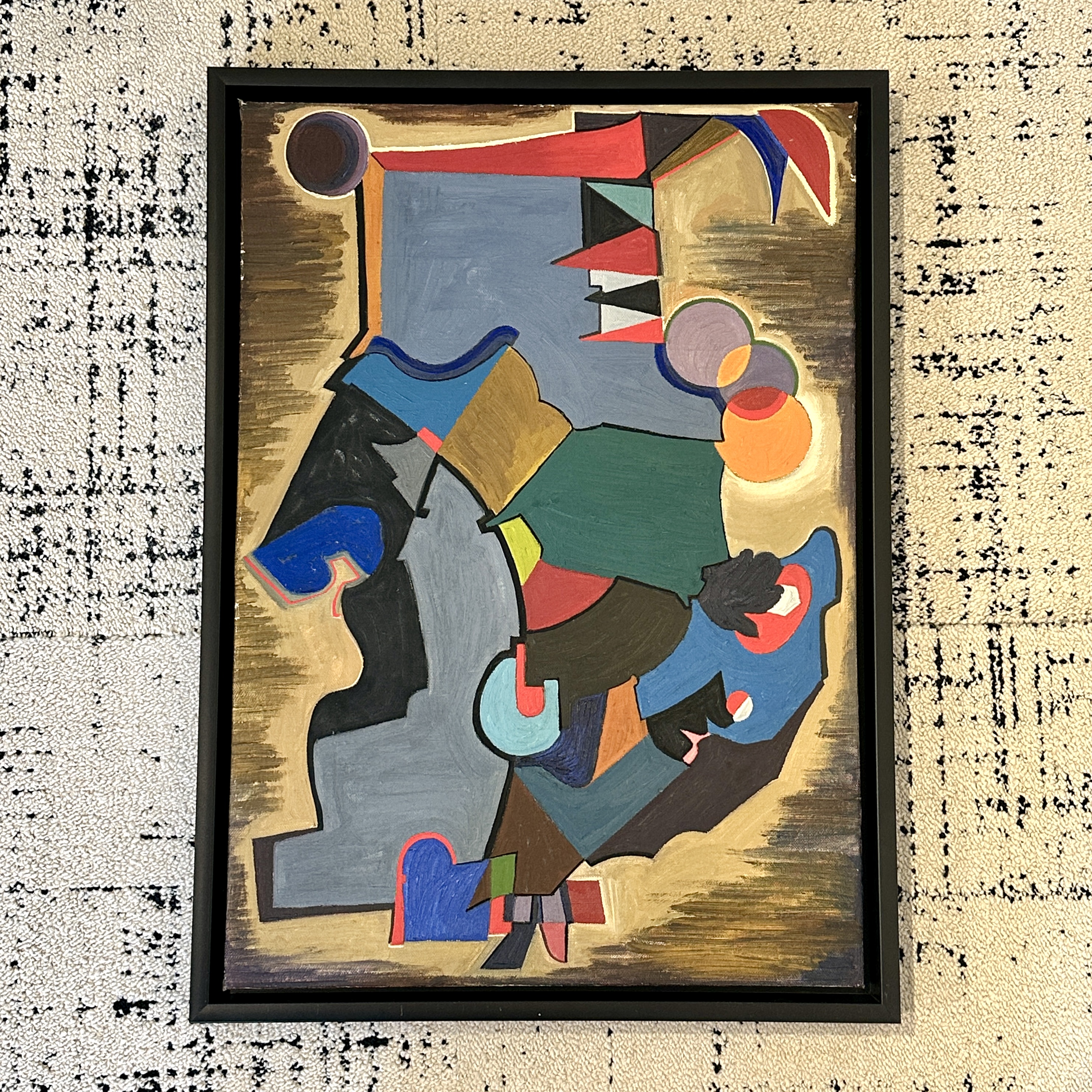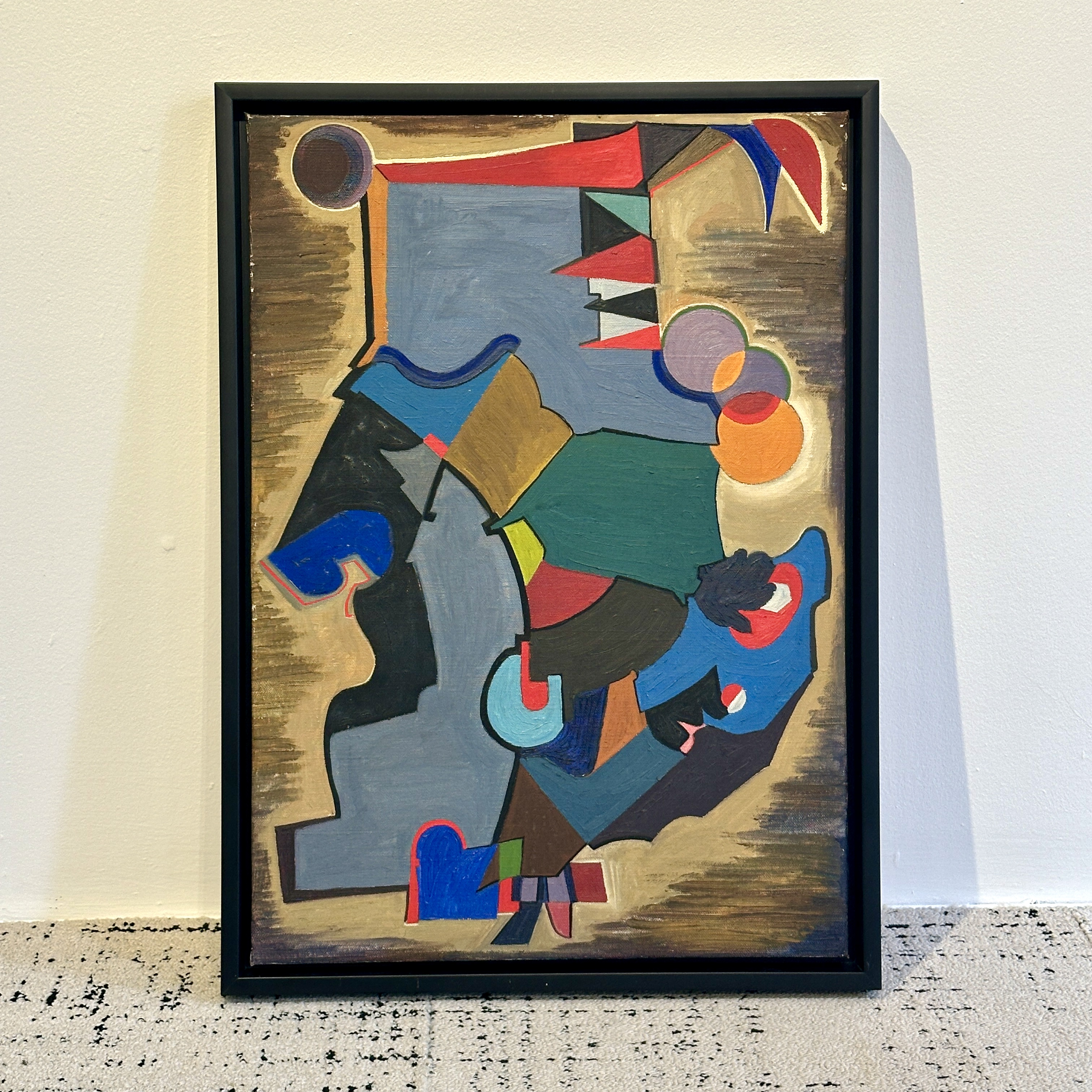 Abstract oil painting. Oil on canvas painting by William Sharp , a geometric abstract composition with interlocking forms on a warm gold ground. signature on verso. America 1940’s Unframed H: 24 In. W: 17. In.