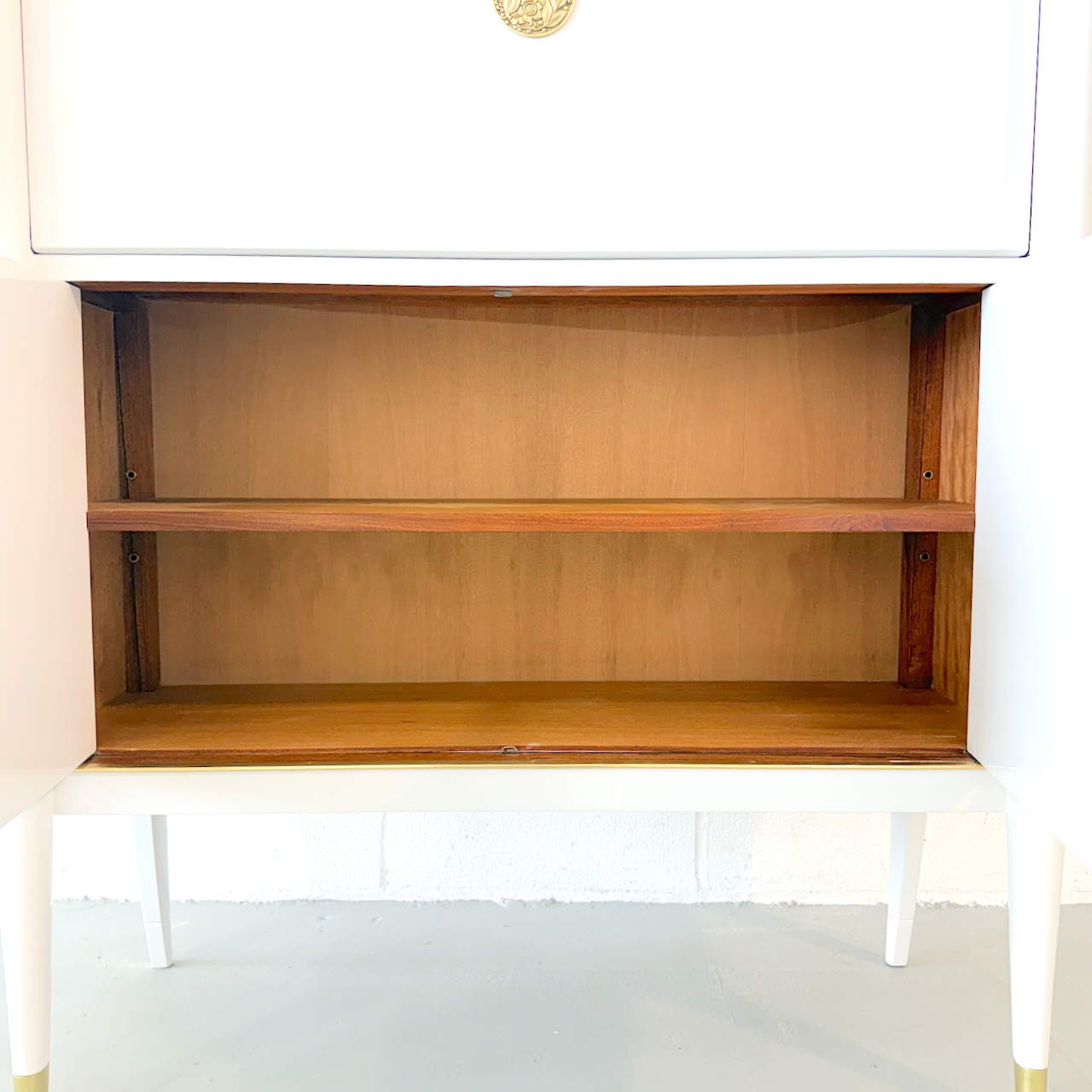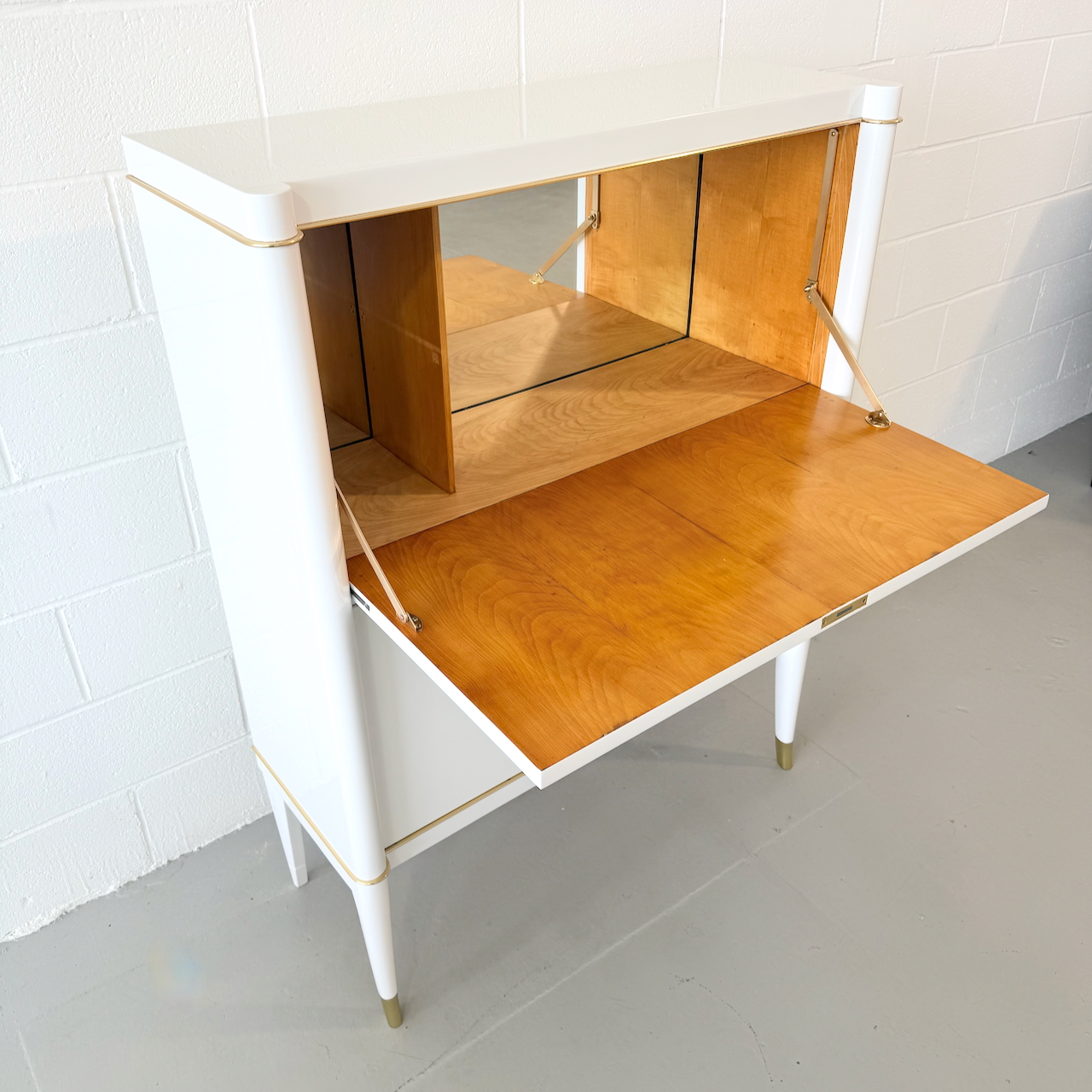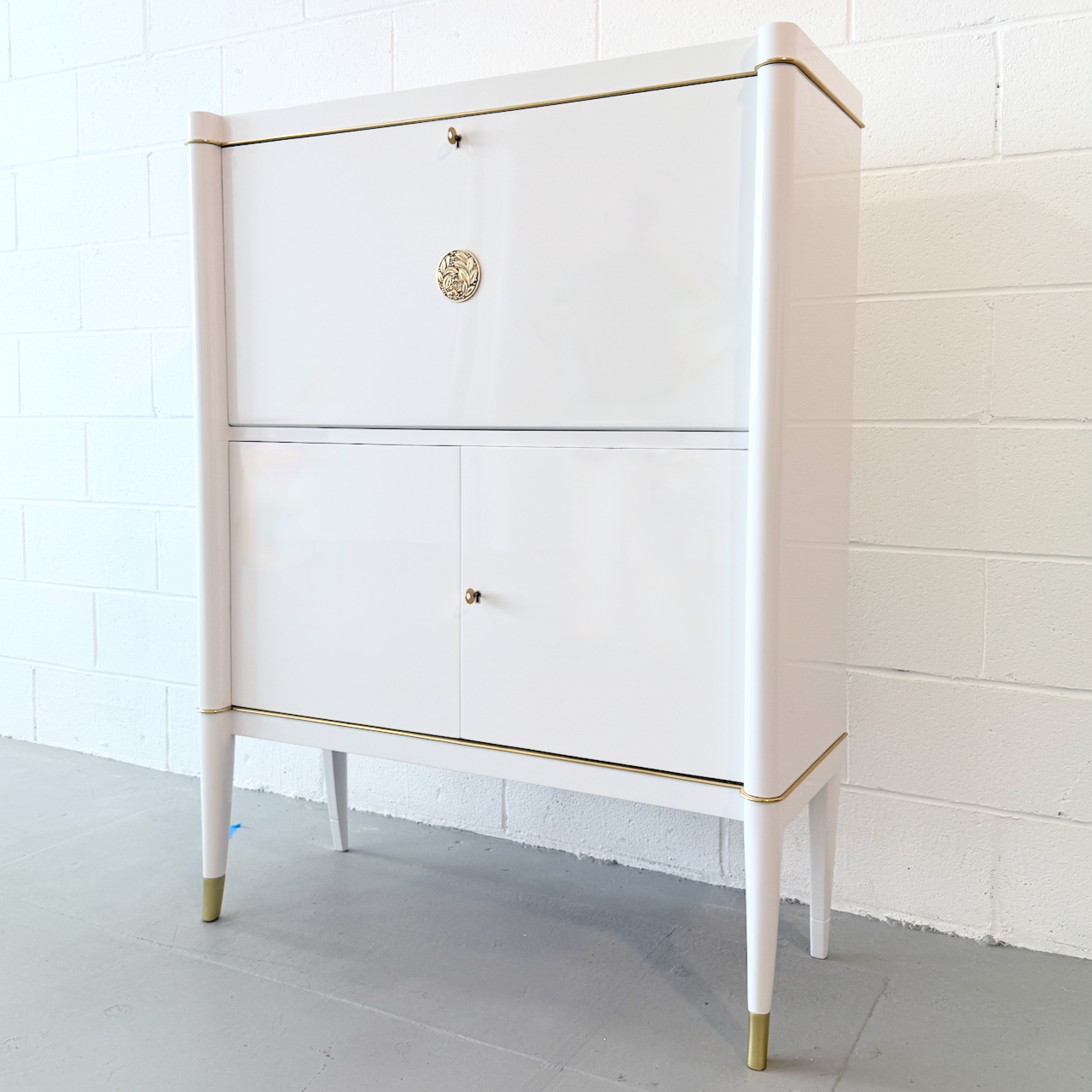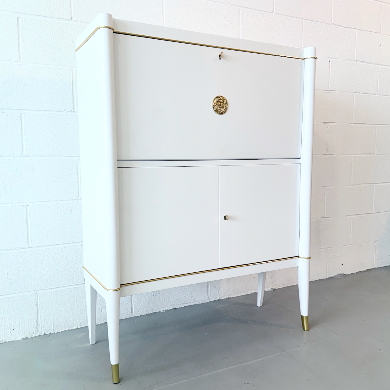 Rare Art Deco Secretary by De Coene Frères, Belgium, 1930. Ivory lacquered with patinated bronze medallions, hardware and sabots. Maple interior.