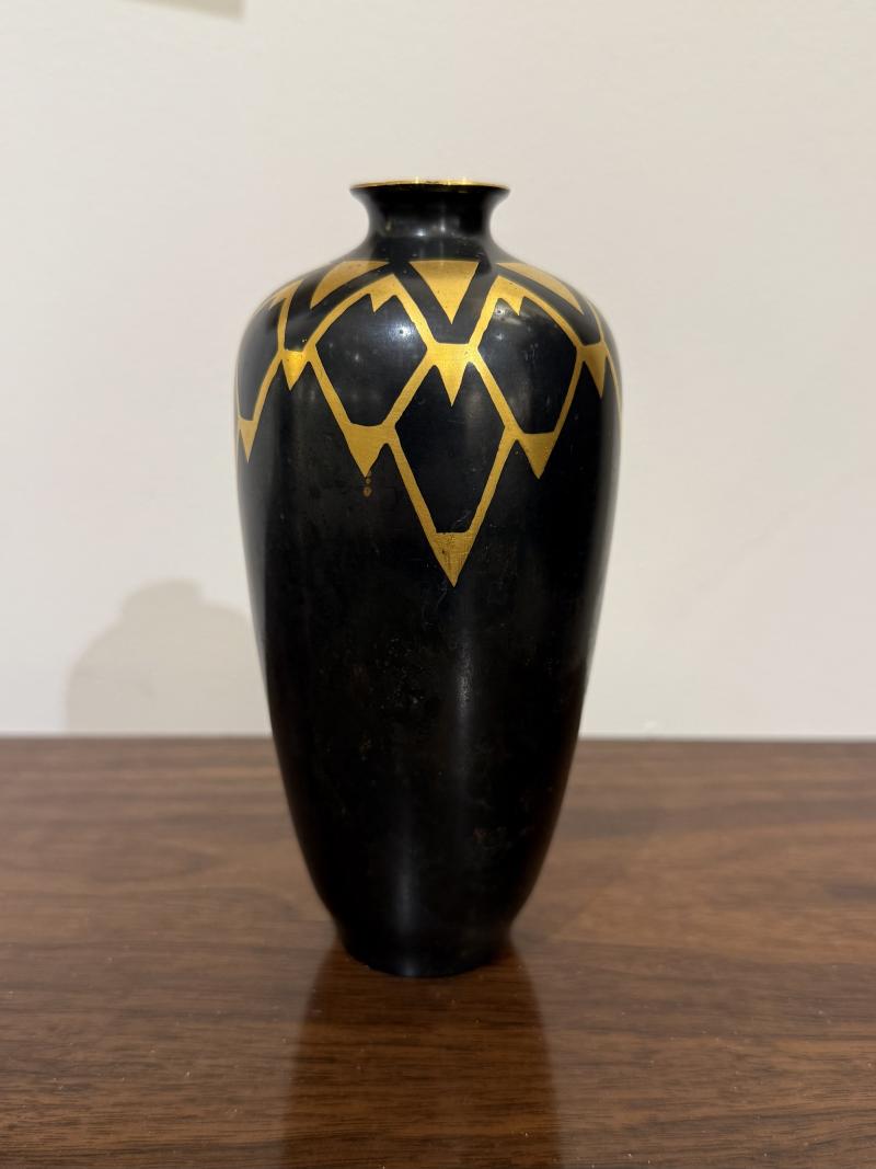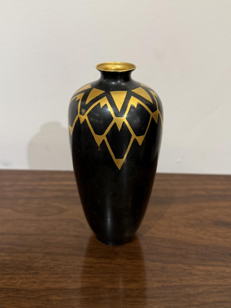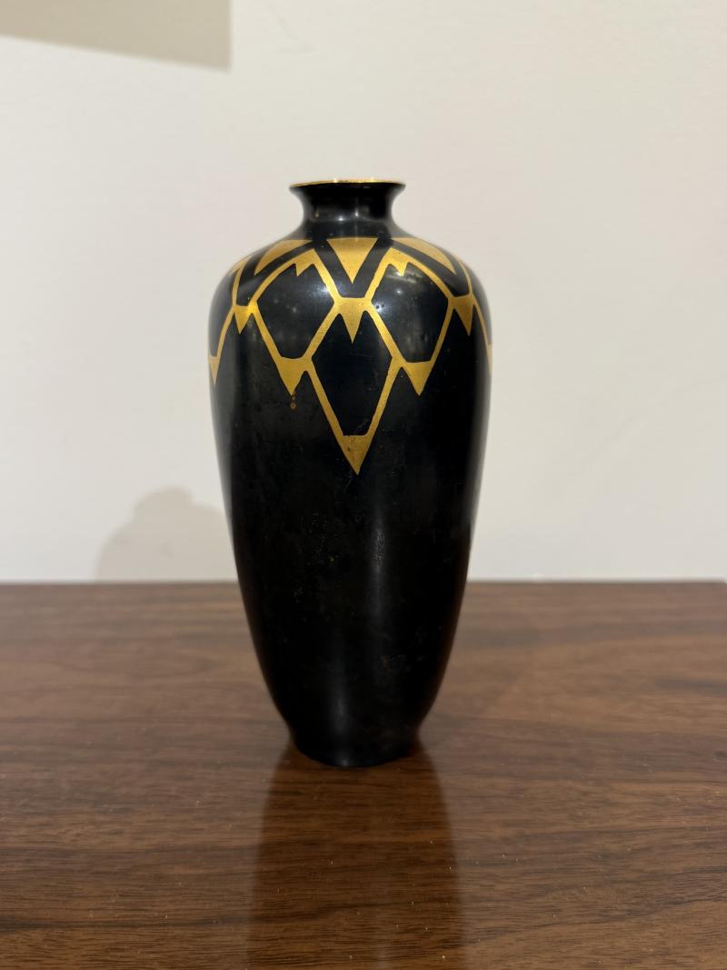 Art Deco Vase by Christofle. Dinanderie metal vase with an Art Deco design in gilt at top and neck on black body.