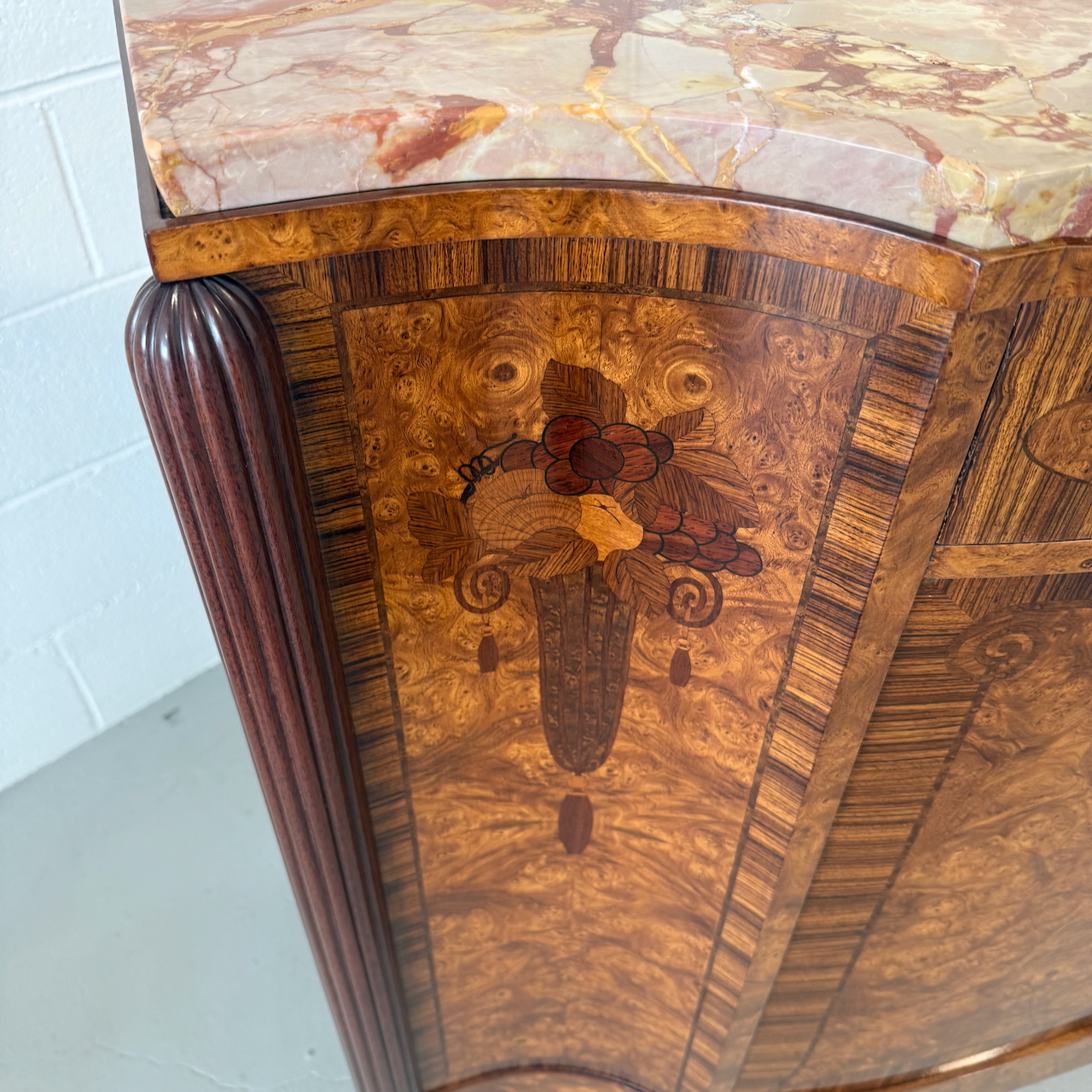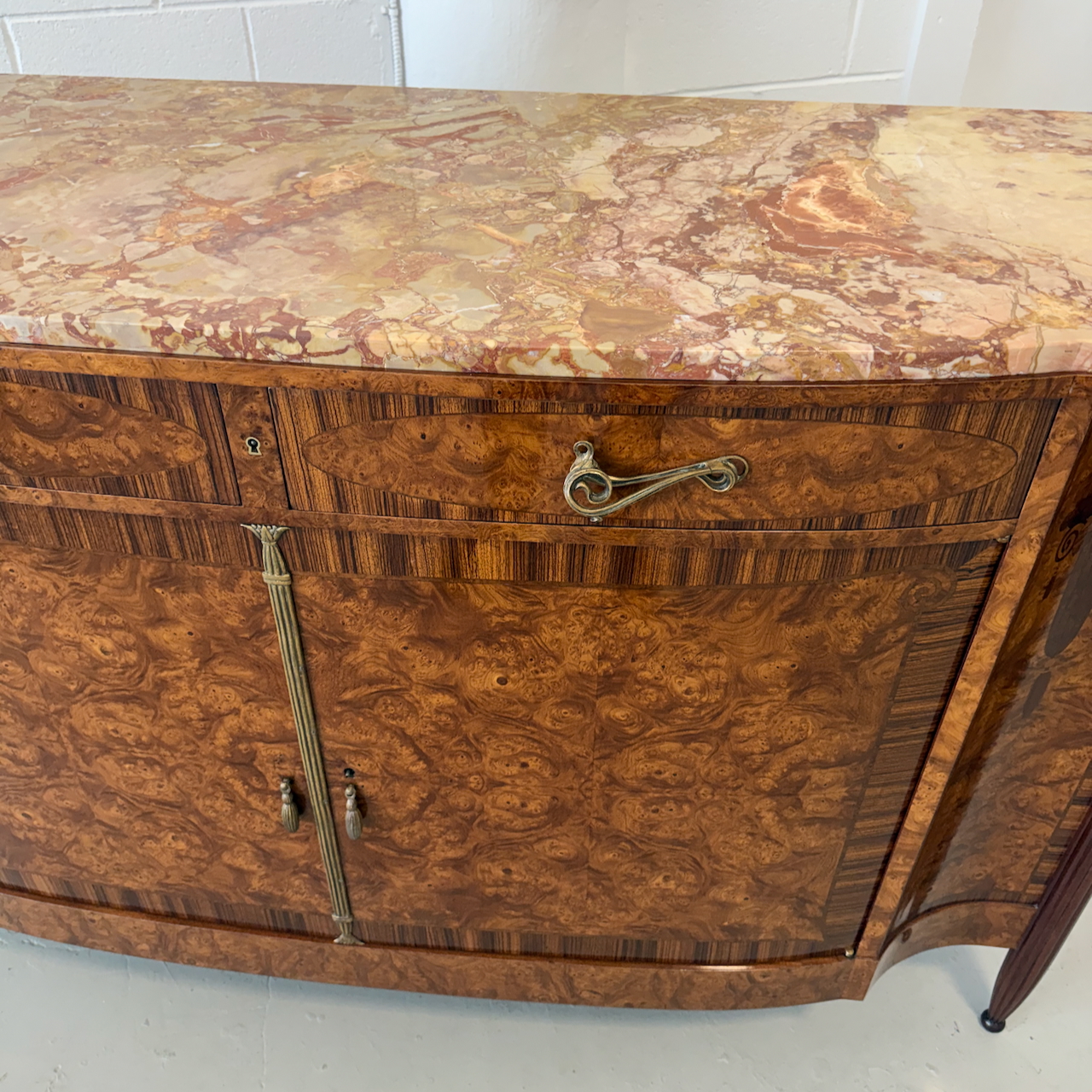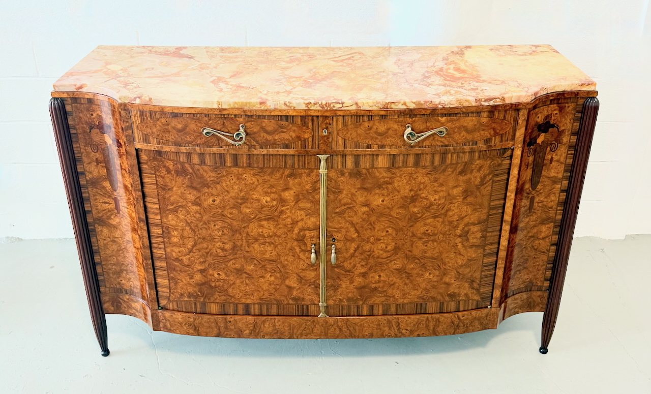 Art Nouveau burled walnut sideboard with original marble top. Demilune form with large book-matched veneer doors and tulipwood marquetry details depicting bouquets of flowers. French polished with gilt-bronze mounts. France, Circa 1915.