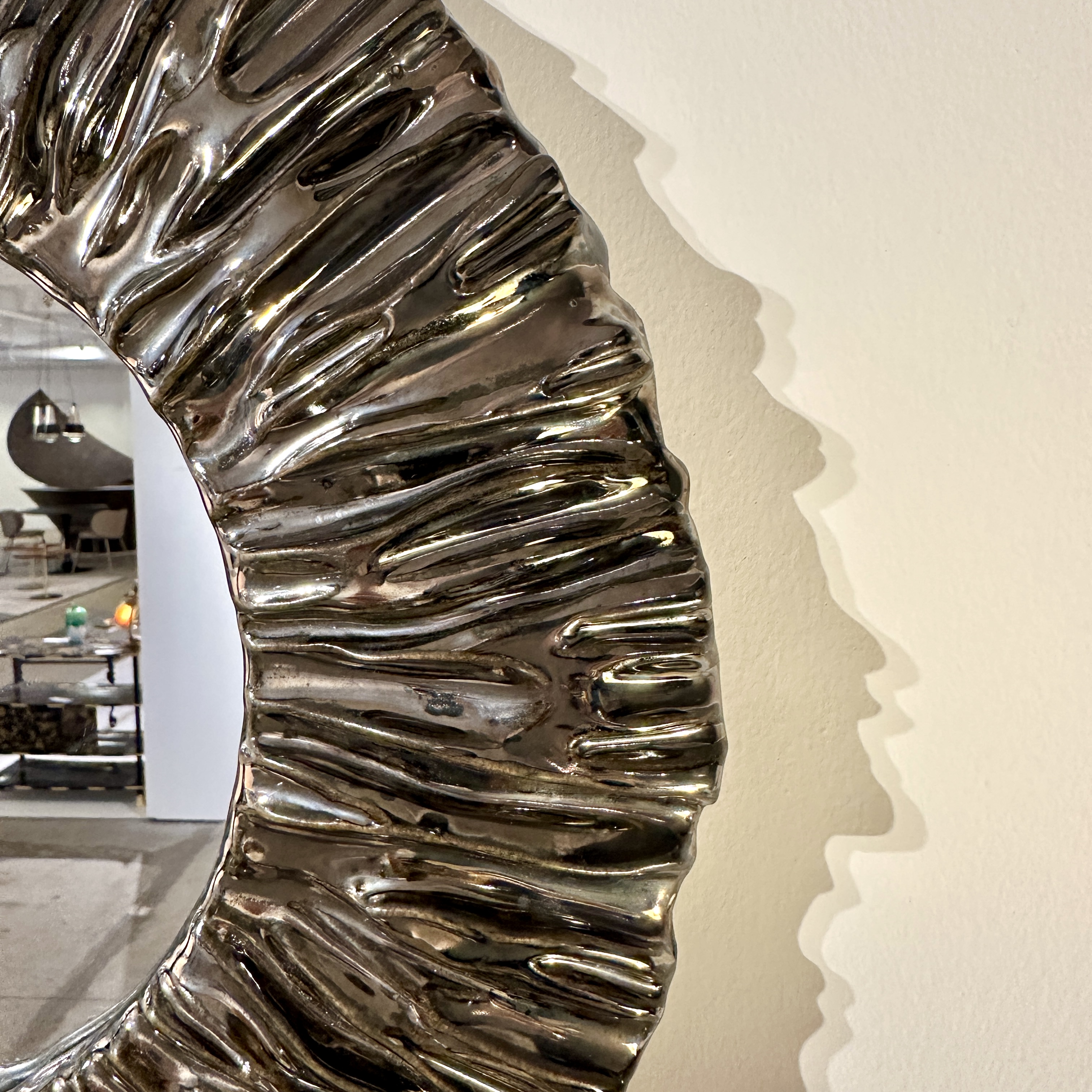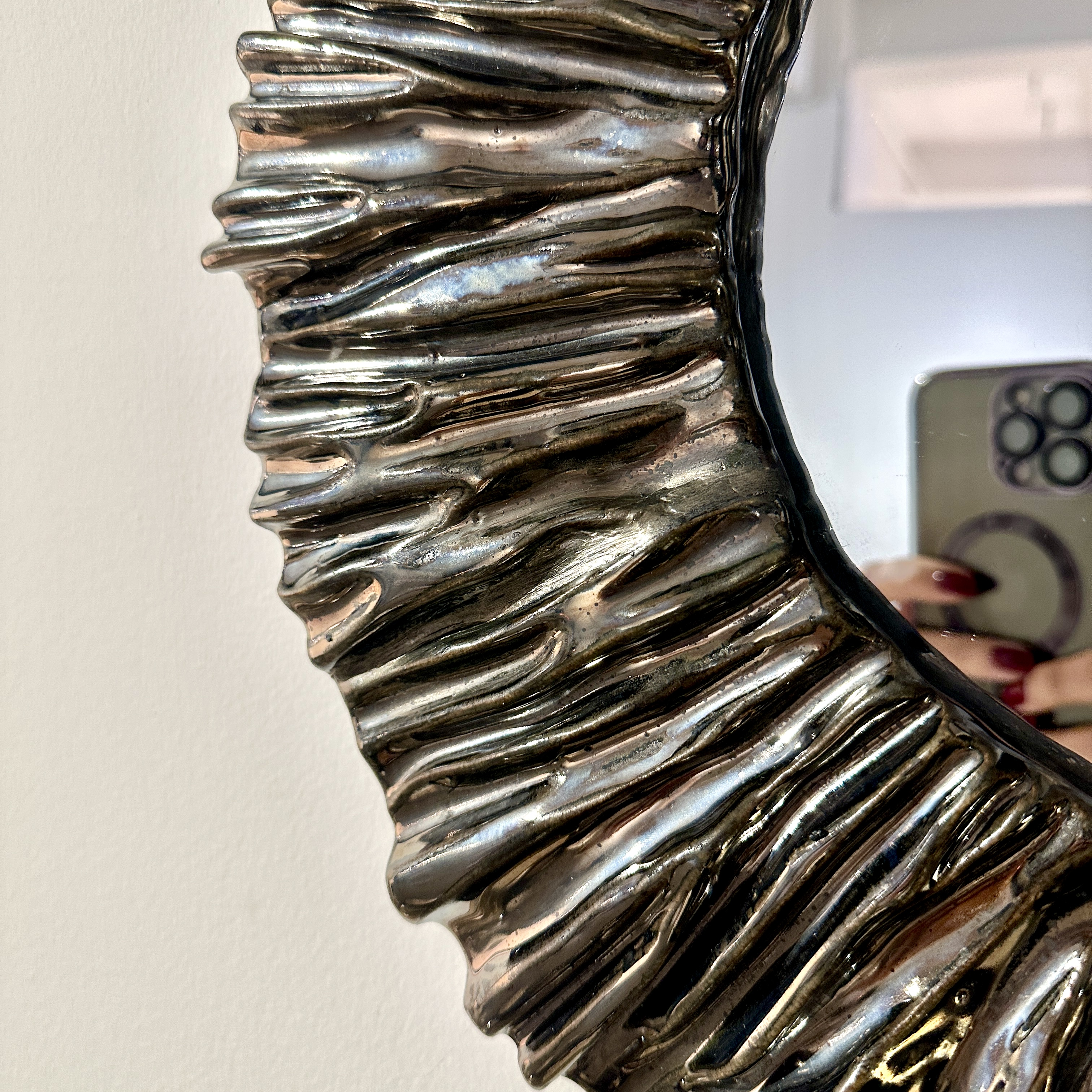 Ruffled ceramic wall mirror. Ceramic glazed frame in platinum finish. Made By Aram C.