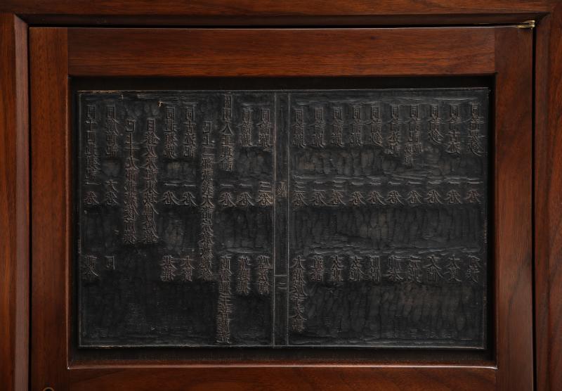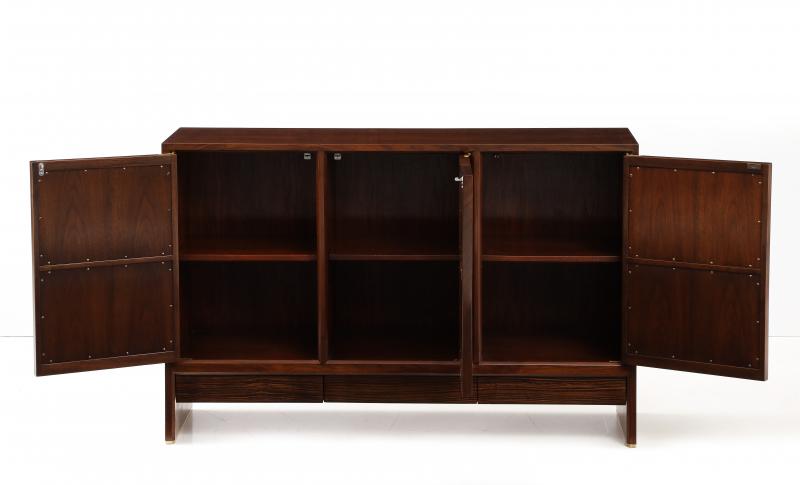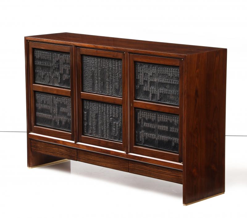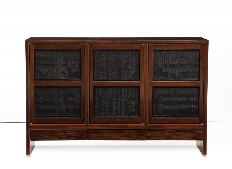 Three-door walnut cabinet designed by Edward Wormley for Dunbar. Each door is inset with carved antique Chinese wood printing blocks. Three flush-front drawers of rosewood beneath.