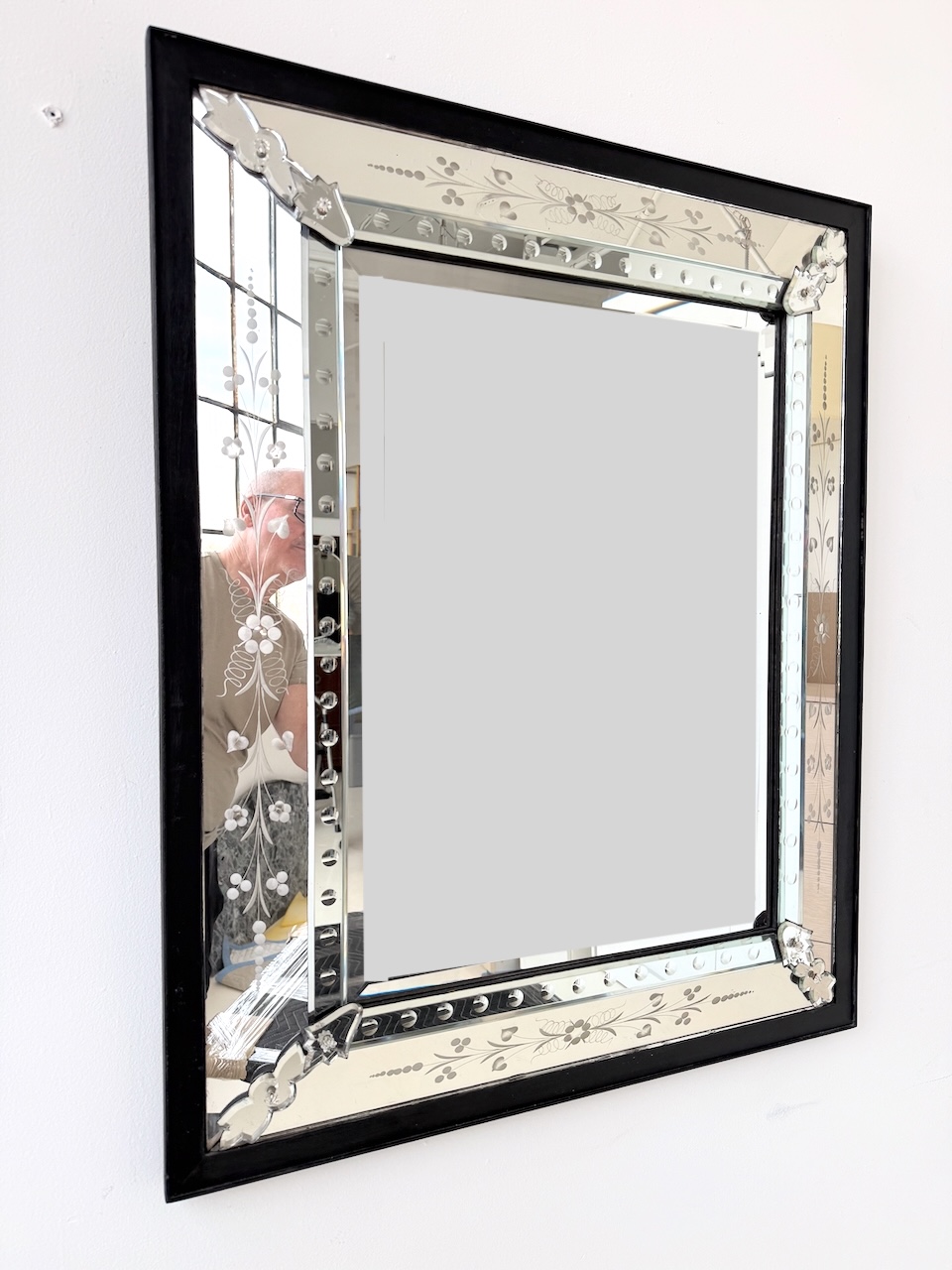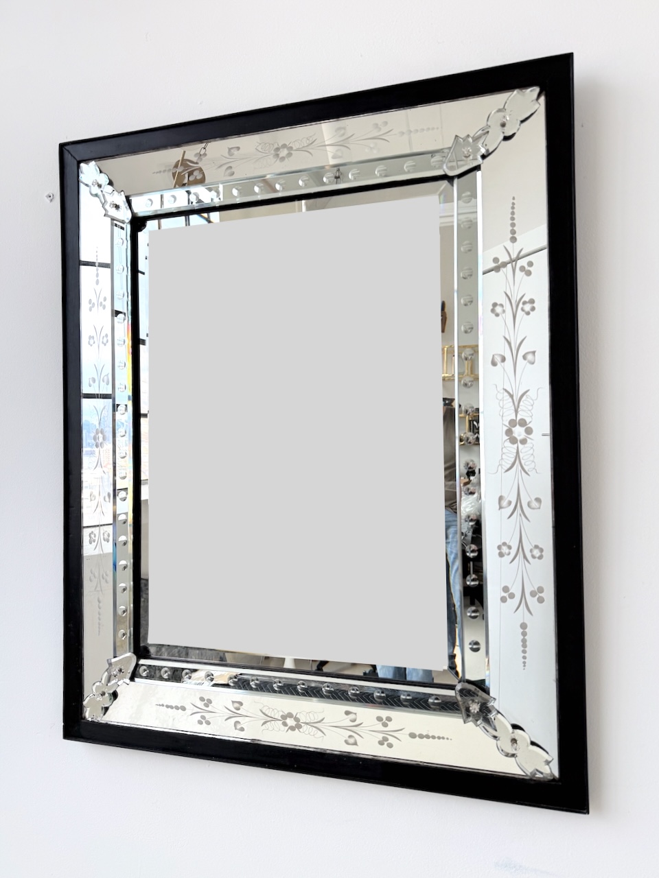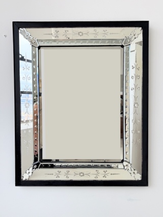 Classic Mid Century Venetian Mirror. Surrounded by a shadow-box frame, with beveled glass detailing around the perimeter. Italy. 1950's