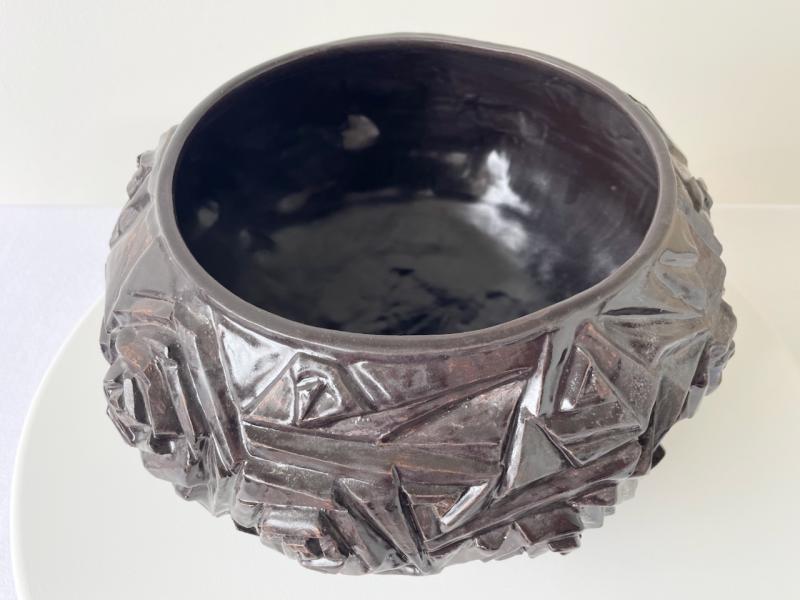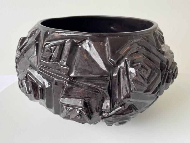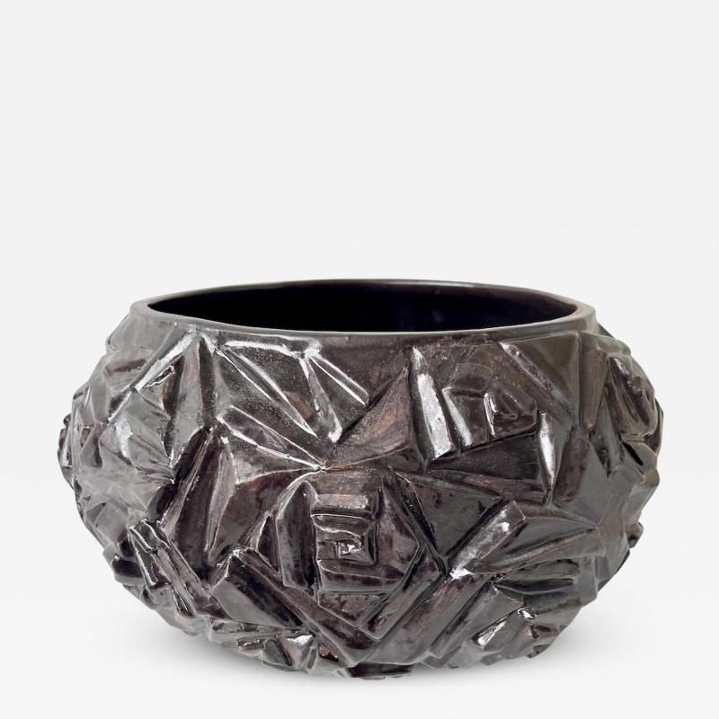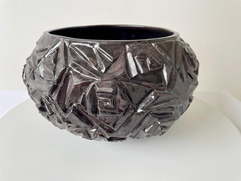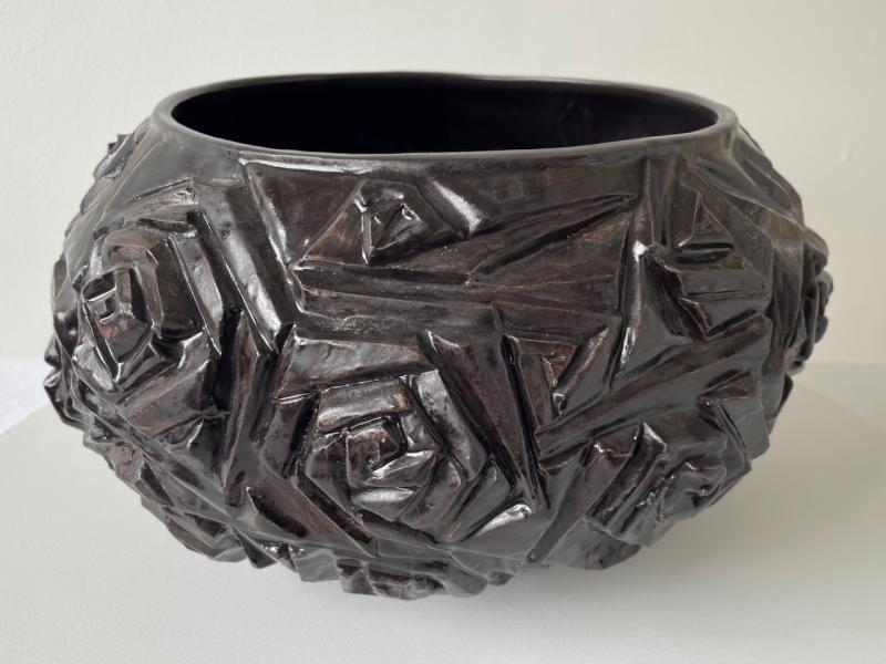“Deco Rose Geometric Ceramic Vessel by R.A. Pesce, Black Glaze”