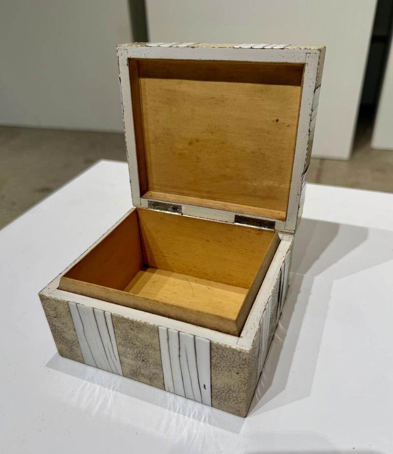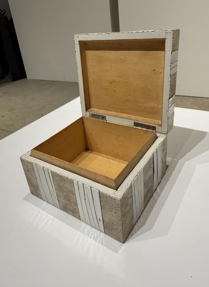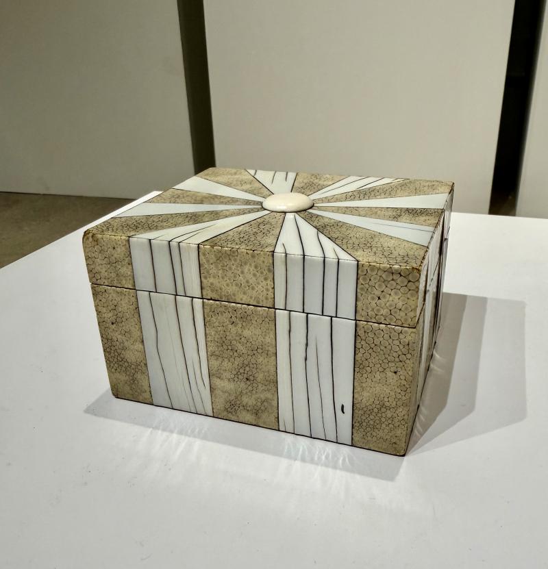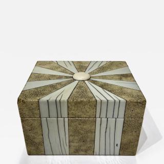 Fine Art Deco Deco shagreen box with bone inlay , hinged lid and wood lined interior. Gilt stamp on leather bottom “London Made” London, England 1920’s