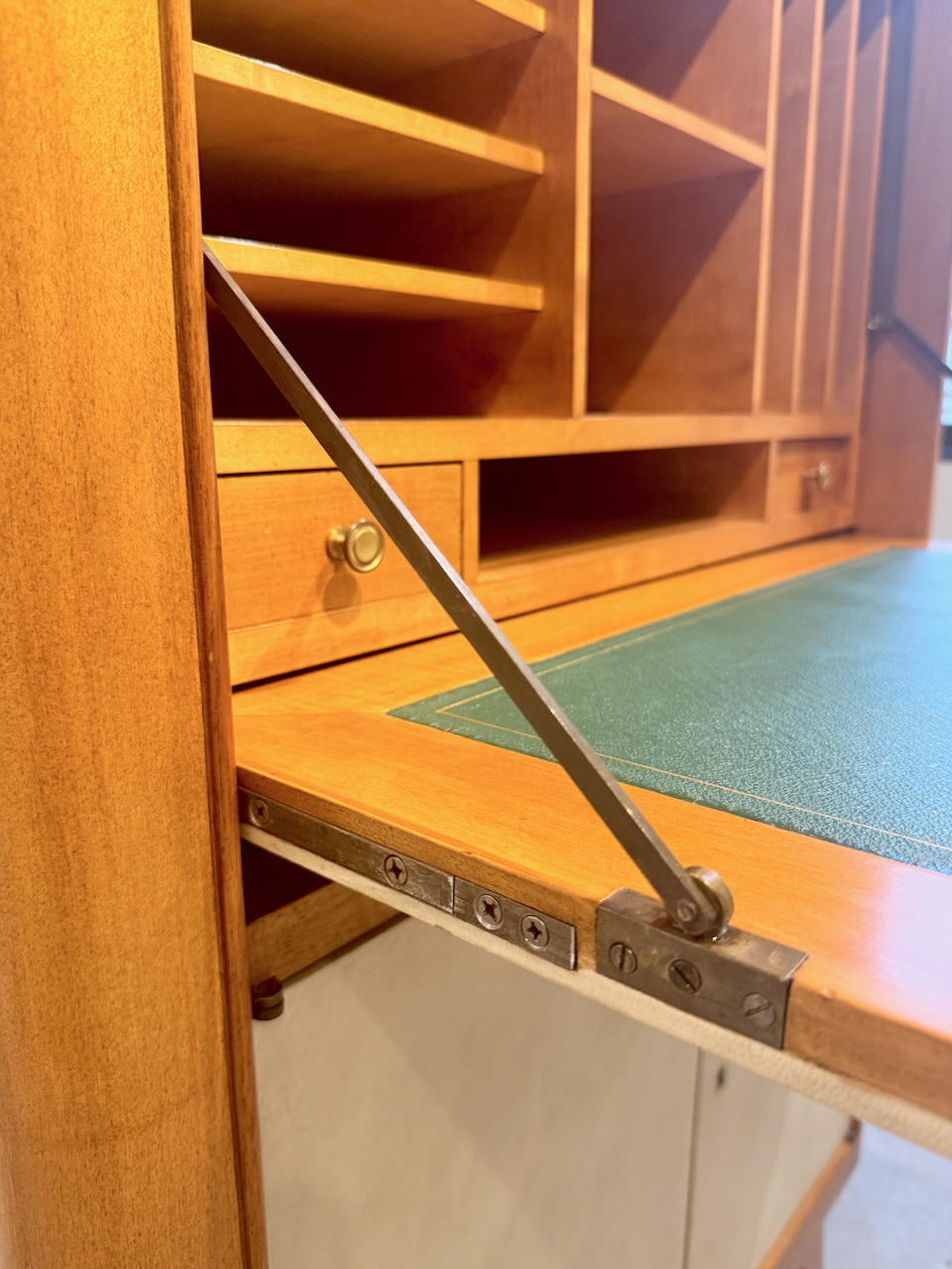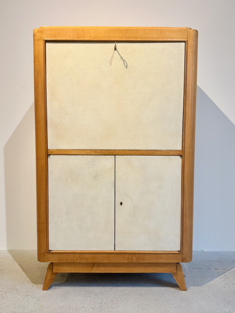 An elegant French "petit secrétaire" from the 1940s. Crafted from beautiful sycamore with parchment front panels, this personal desk features a leather-inset drop-down writing surface. Inside, there are two drawers, several letter compartments and a single key for storing private correspondence. It has been carefully restored and polished to retain its original charm.