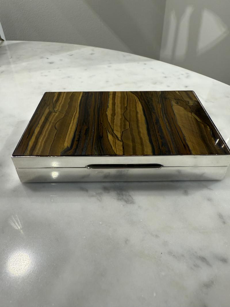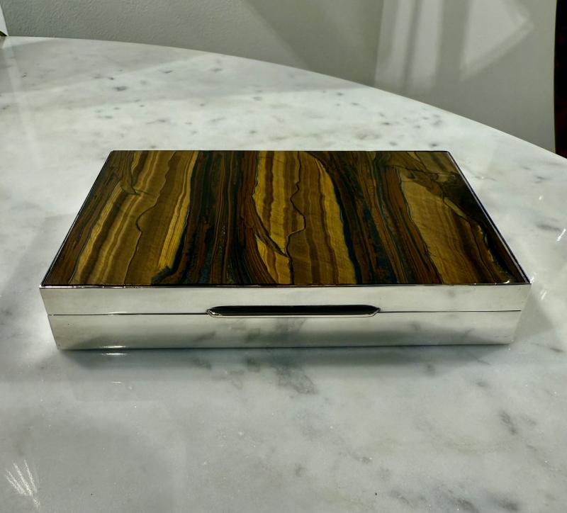 Fine tiger's eye and sterling box. Well figured tiger's eye inset hinged lid on a sterling silver box. Marked .925 Italy 1960’s