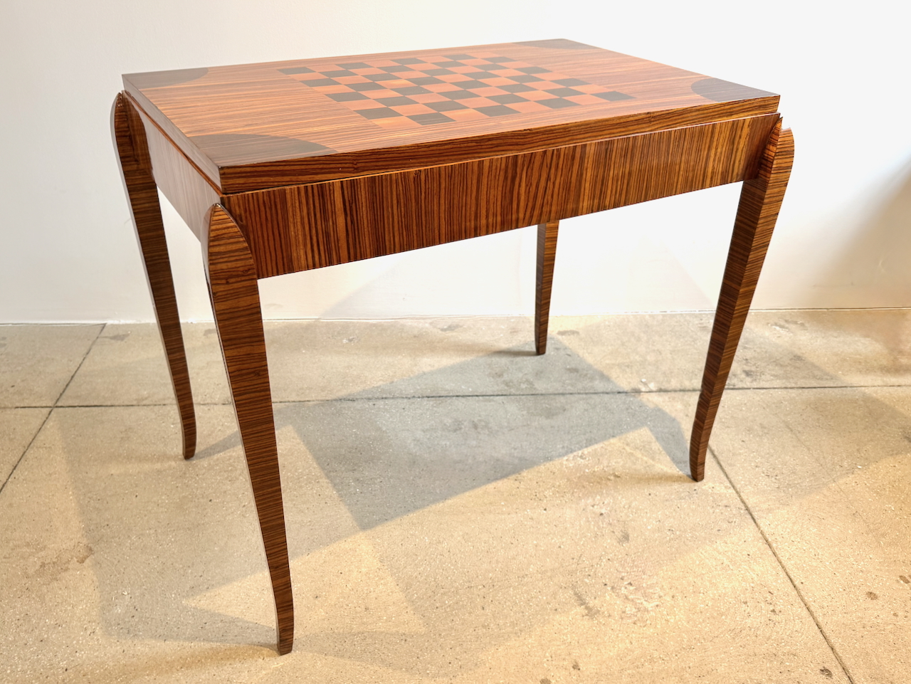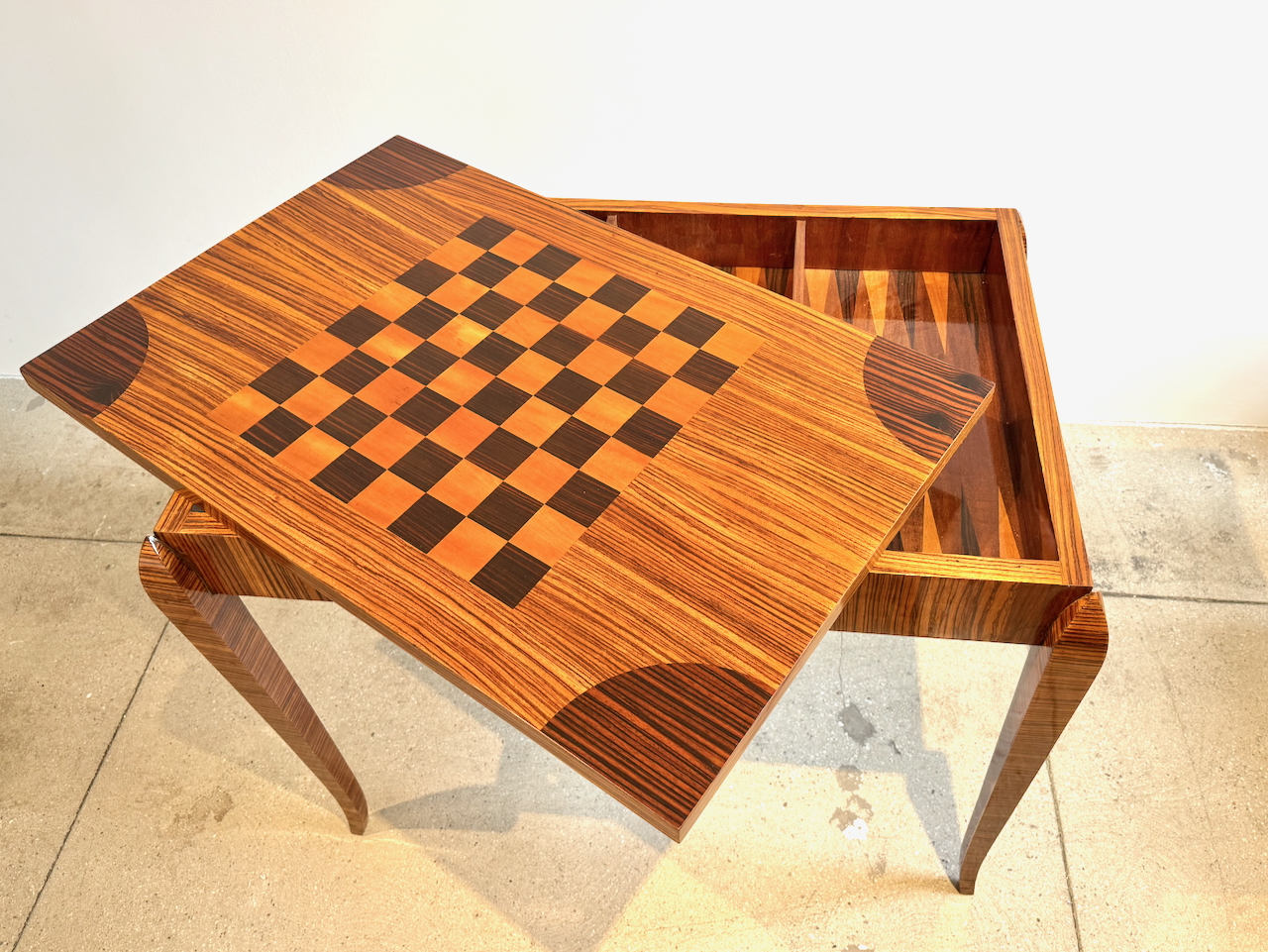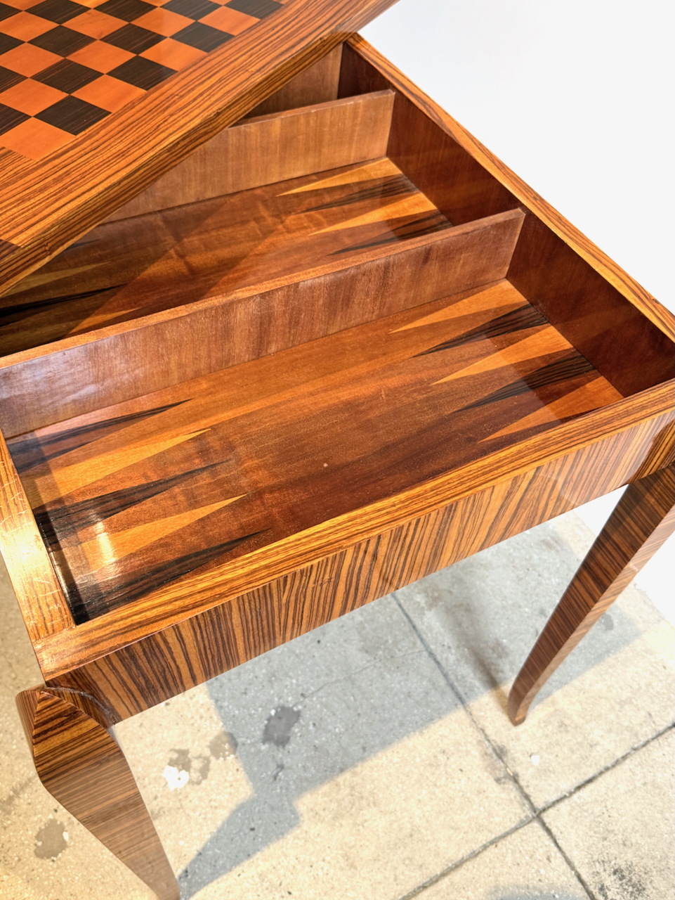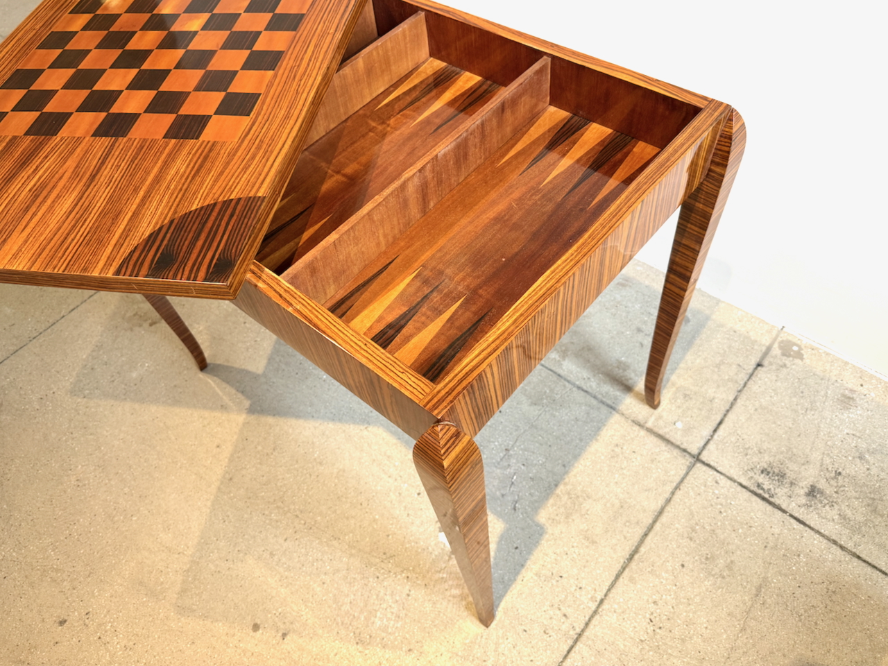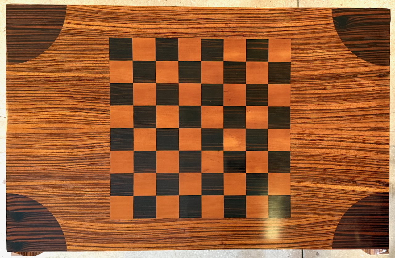 Fine Art Deco Game Table with inlaid checkerboard top and backgammon interior compartment.