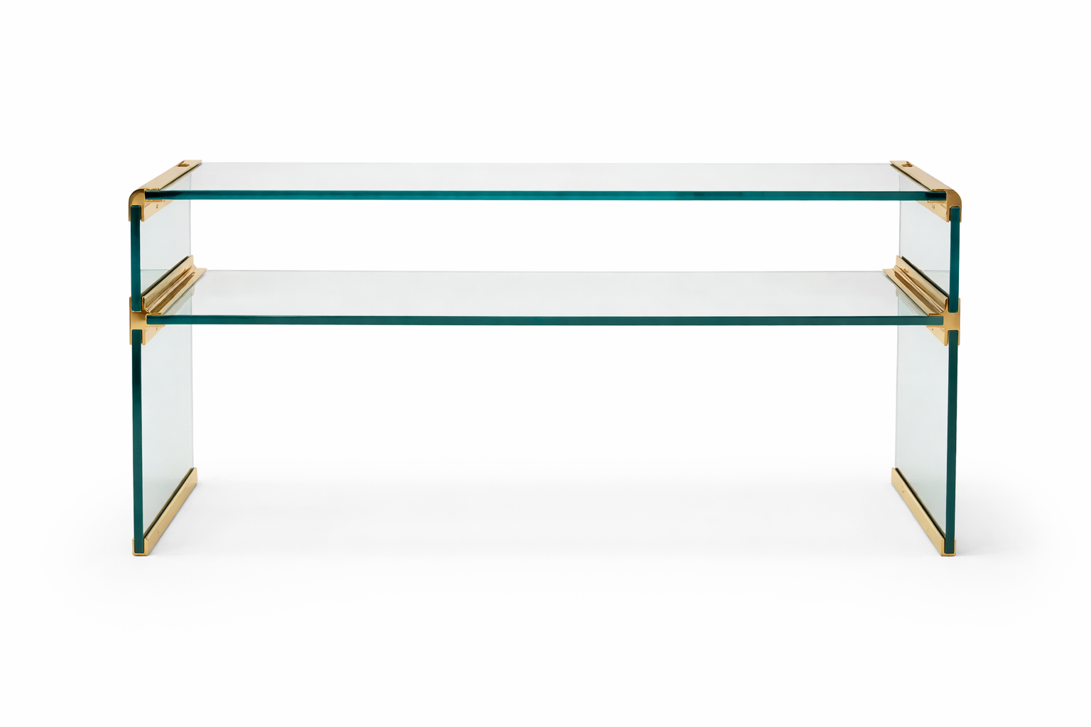 Glass and brass Waterfall console with mid-center shelf by Leon Rosen for the Pace Collection. 3/4-inch tempered glass with solid brass-plated metal corner joints.
