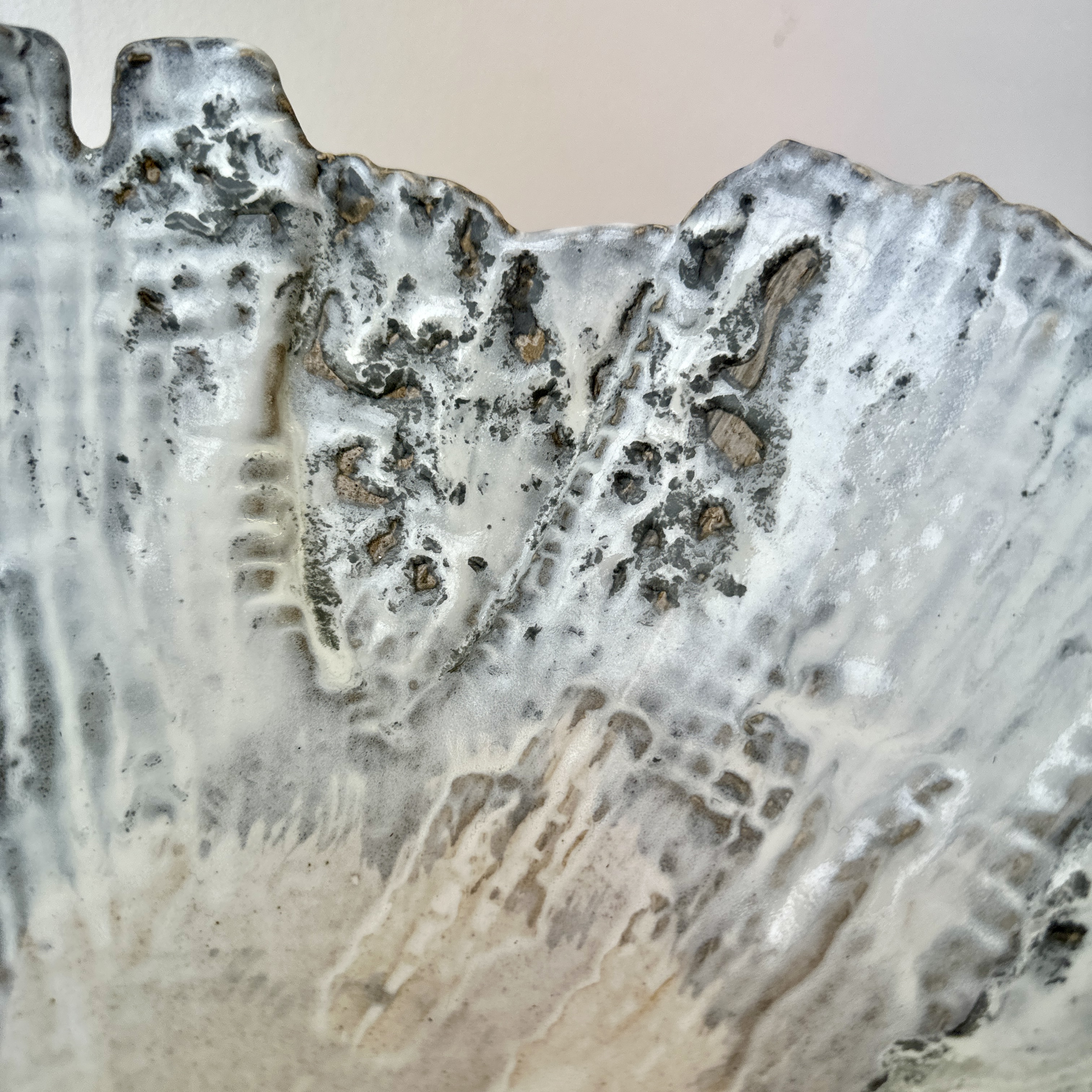 Ruffled ceramic wall mirror. Ceramic glazed frame in platinum finish. Made By Aram C.