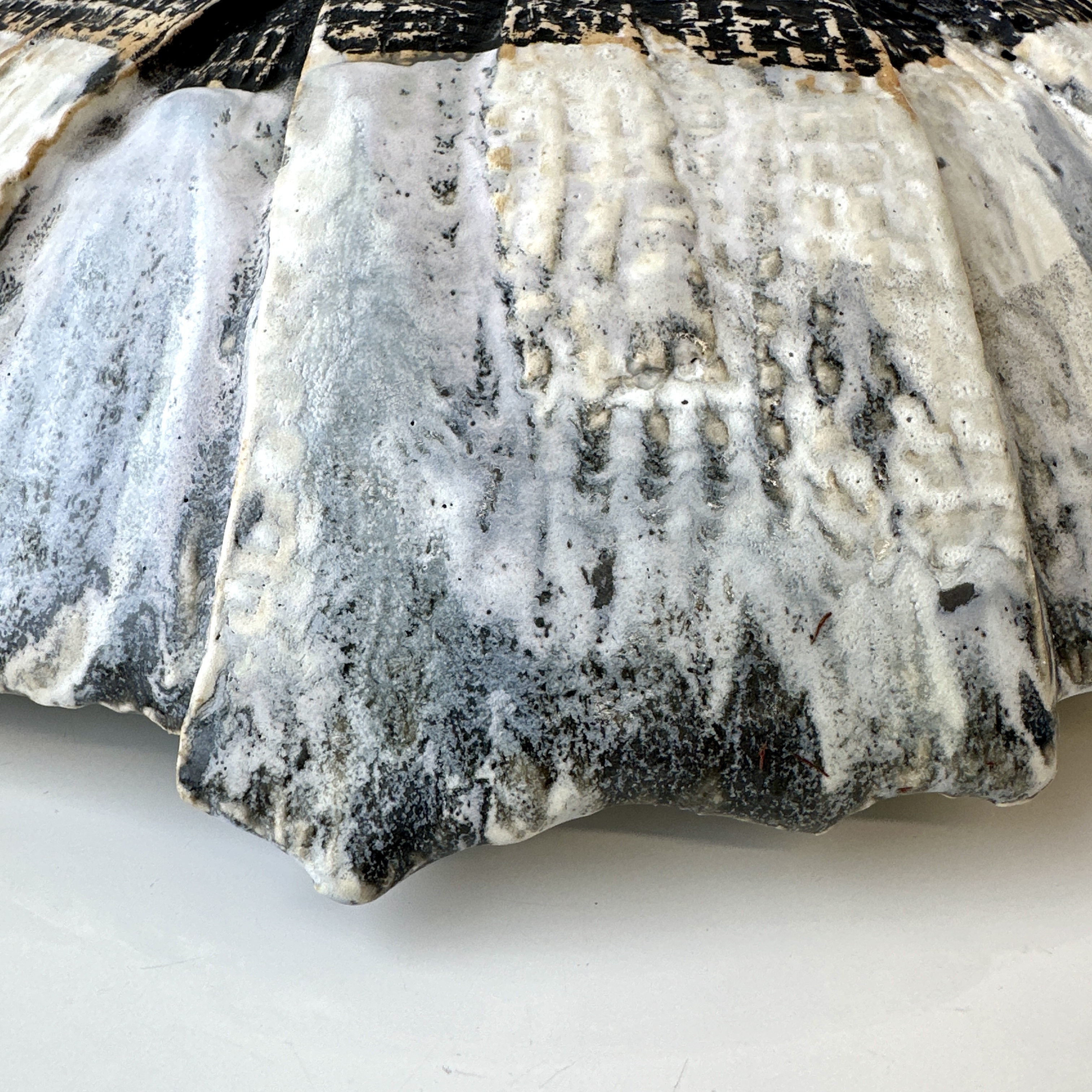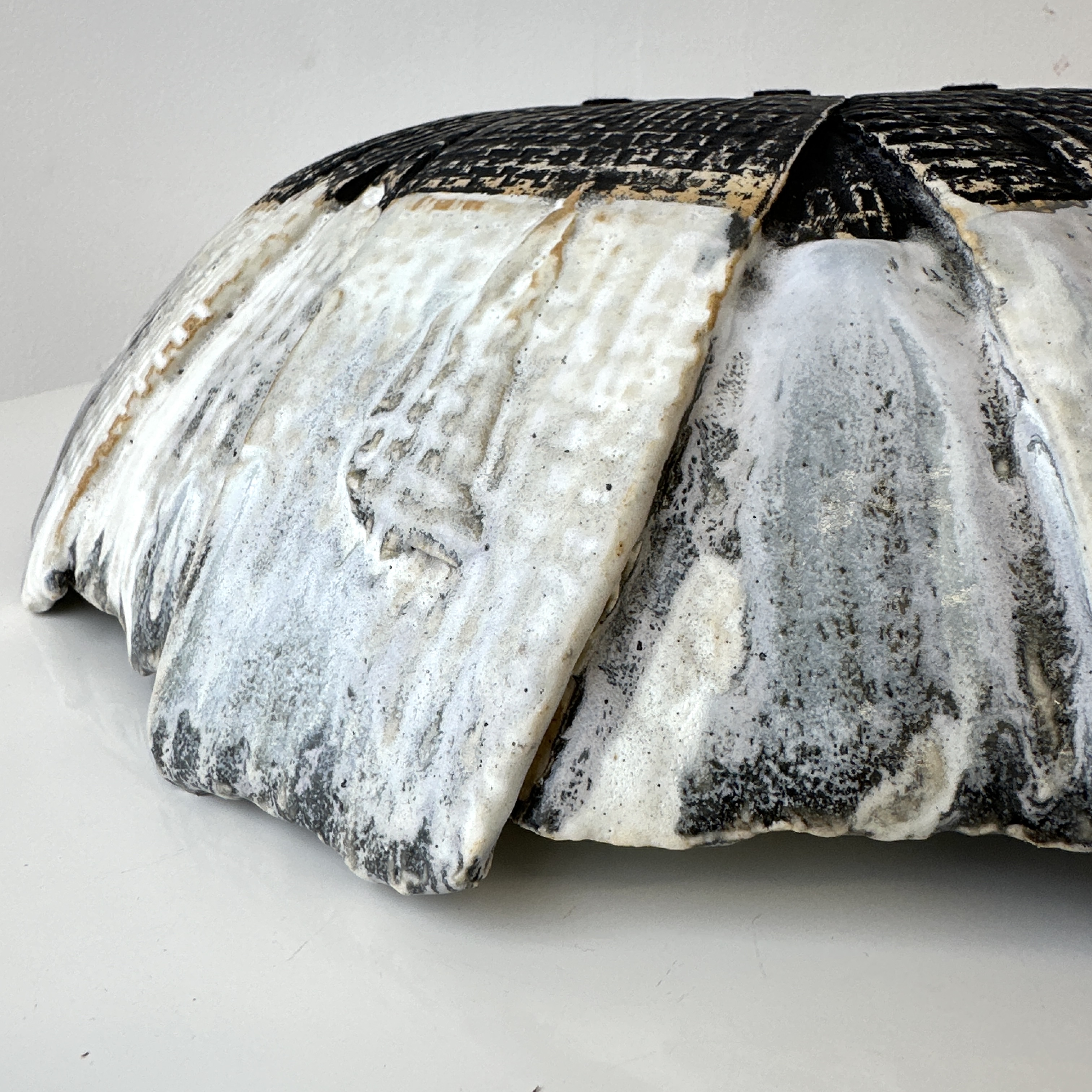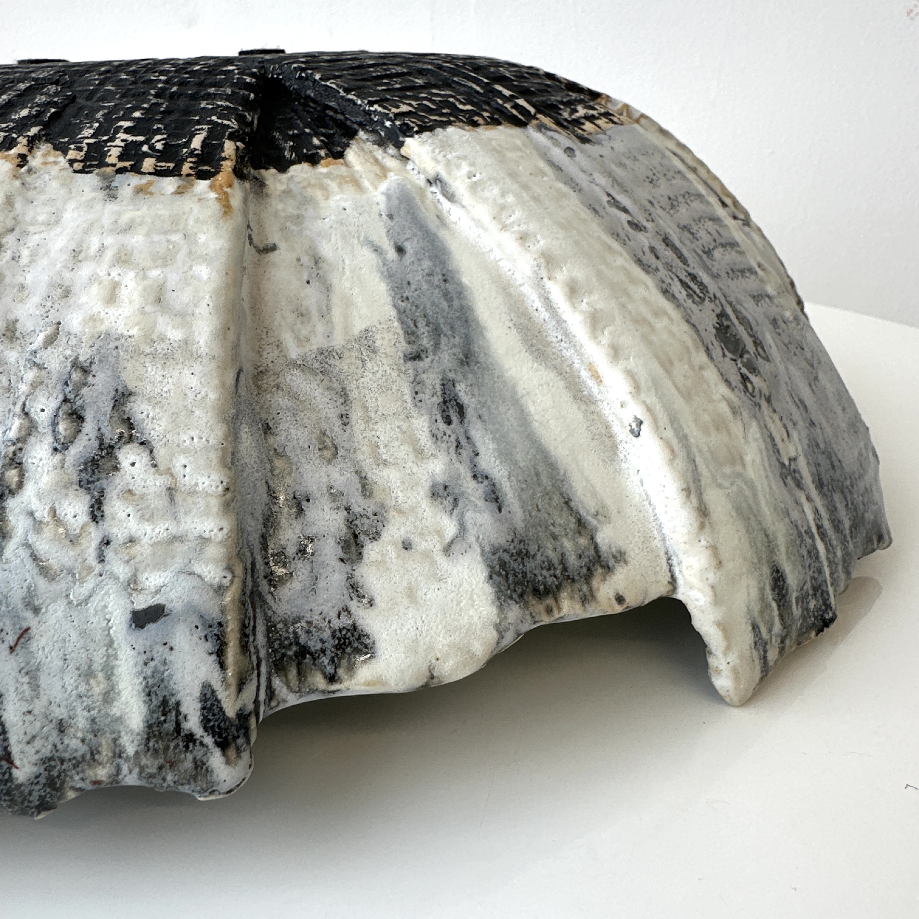 Hand-carved biomorphic vessel in white stoneware with a steel glaze. Signed: RP.