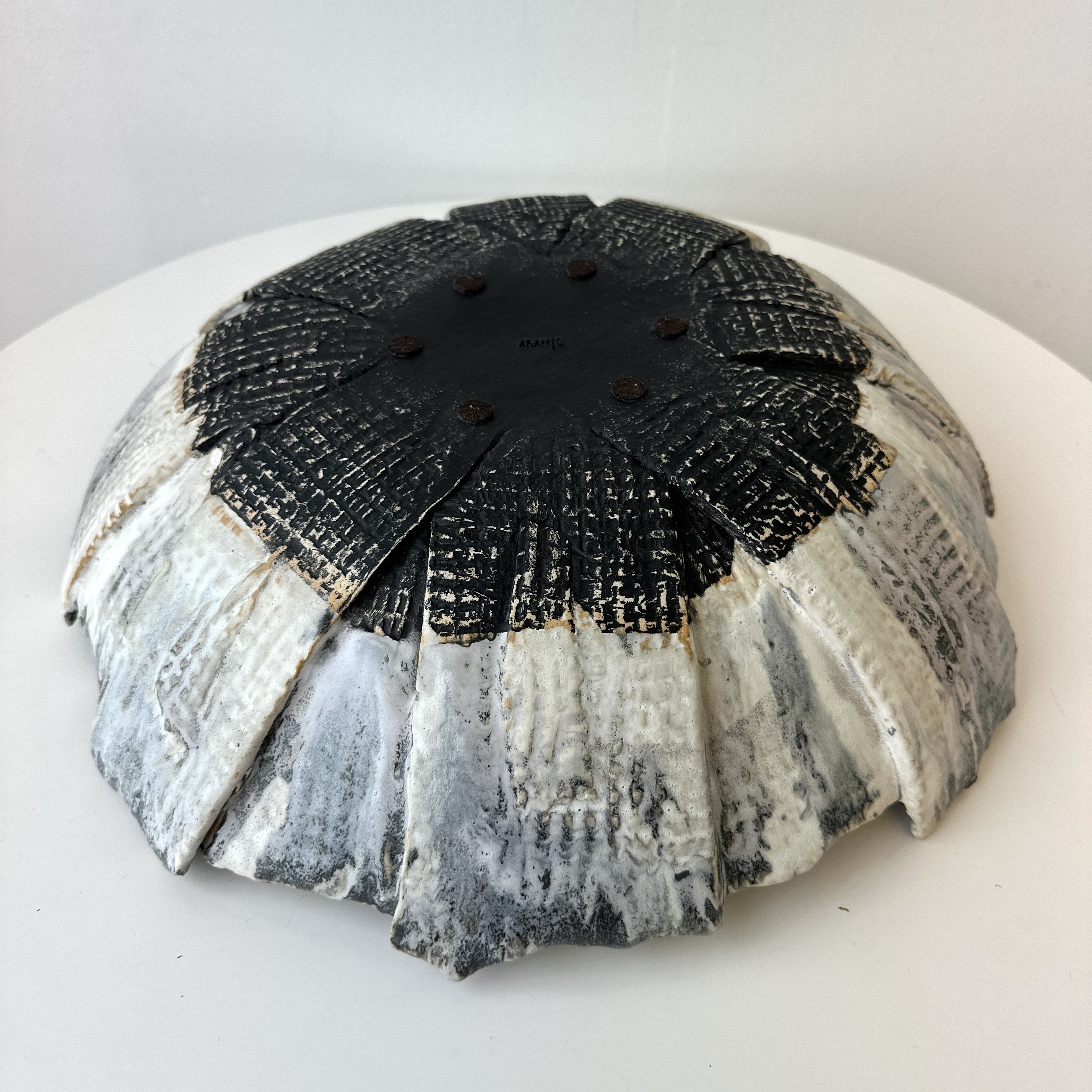 Patterned Ceramic Moonvase #1 with Black-Chrome Glaze. Made By Aram C. Signed "Aram C"