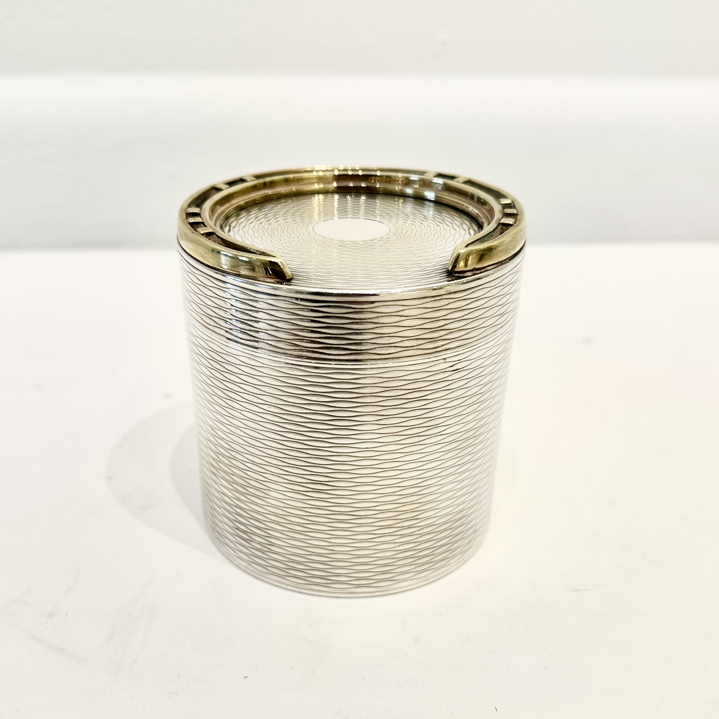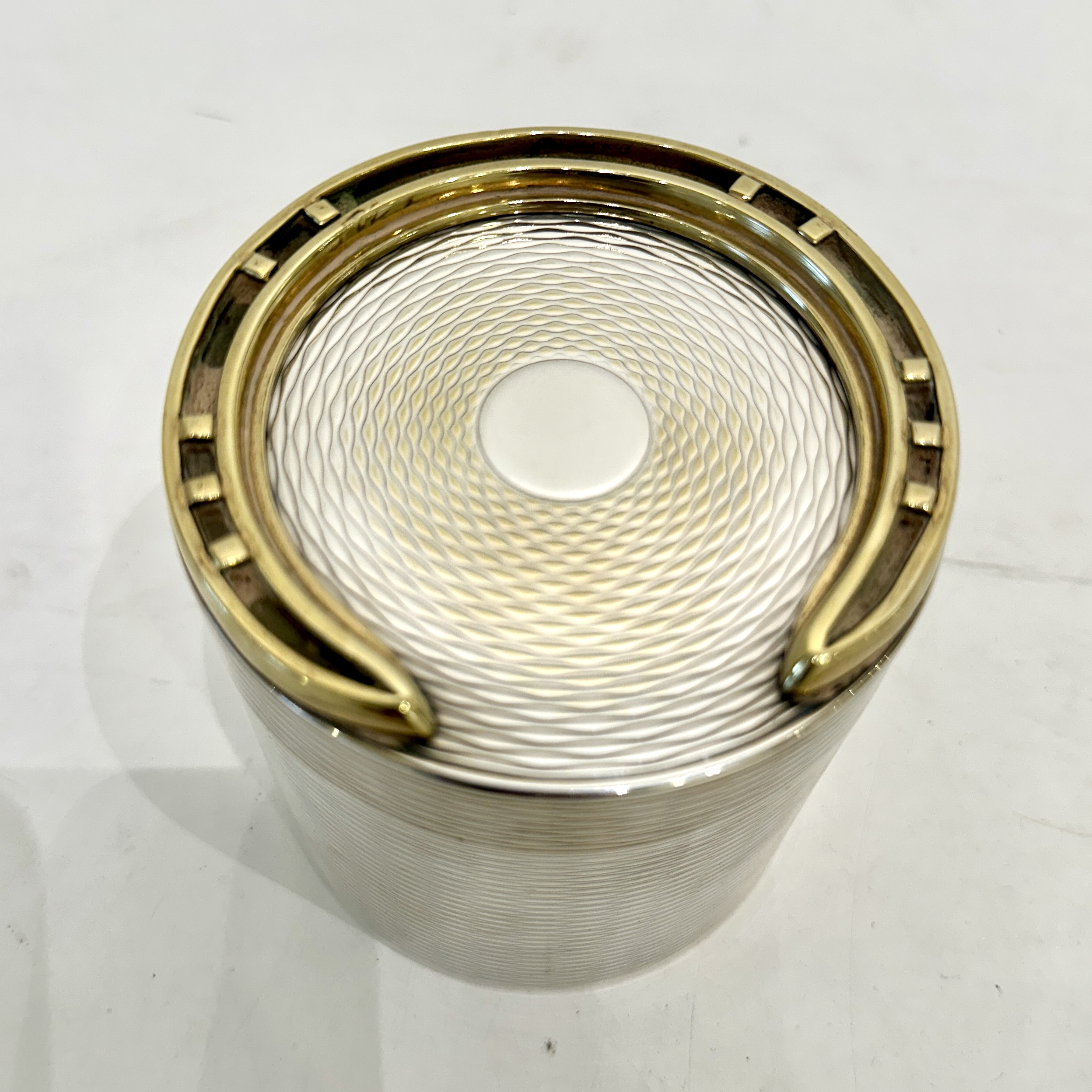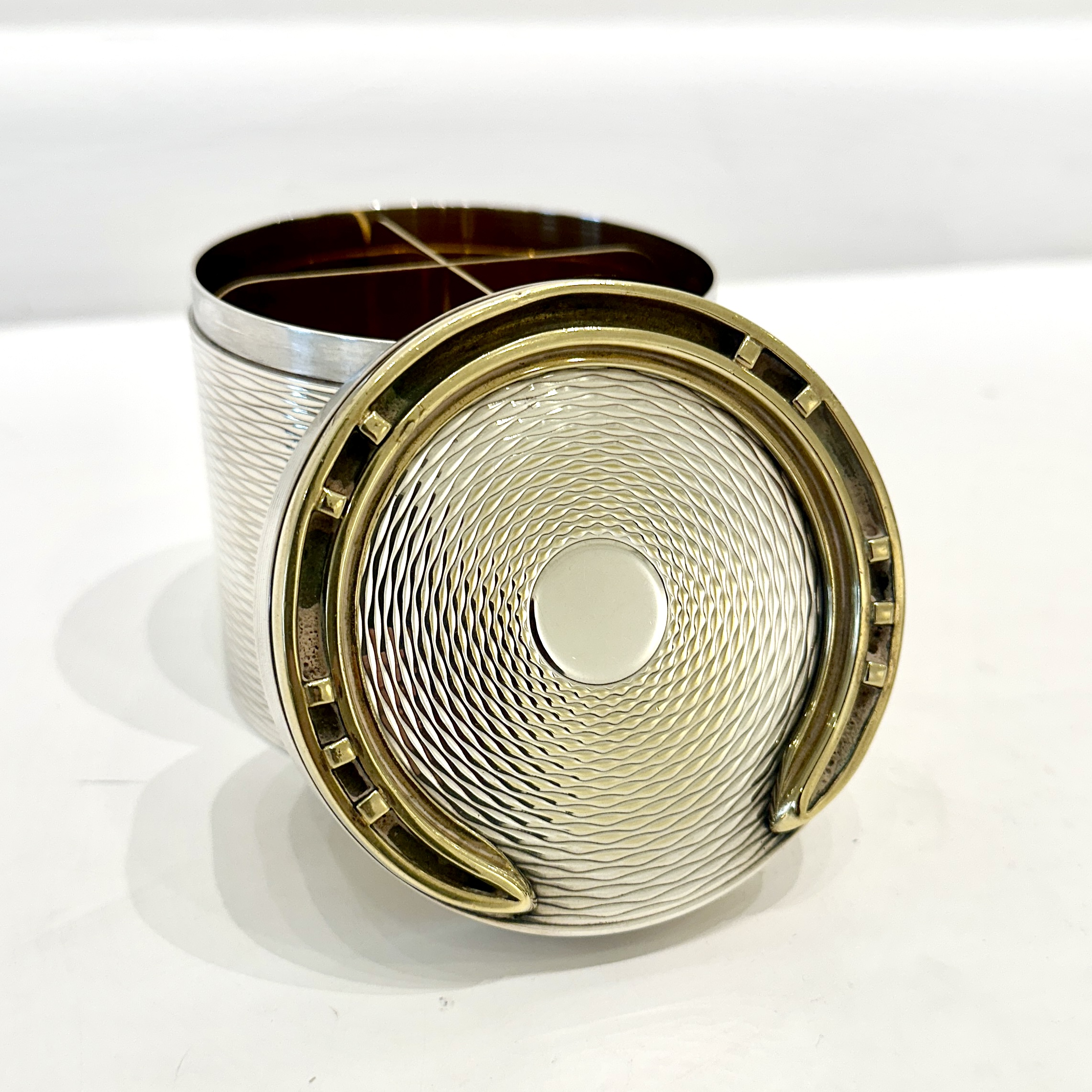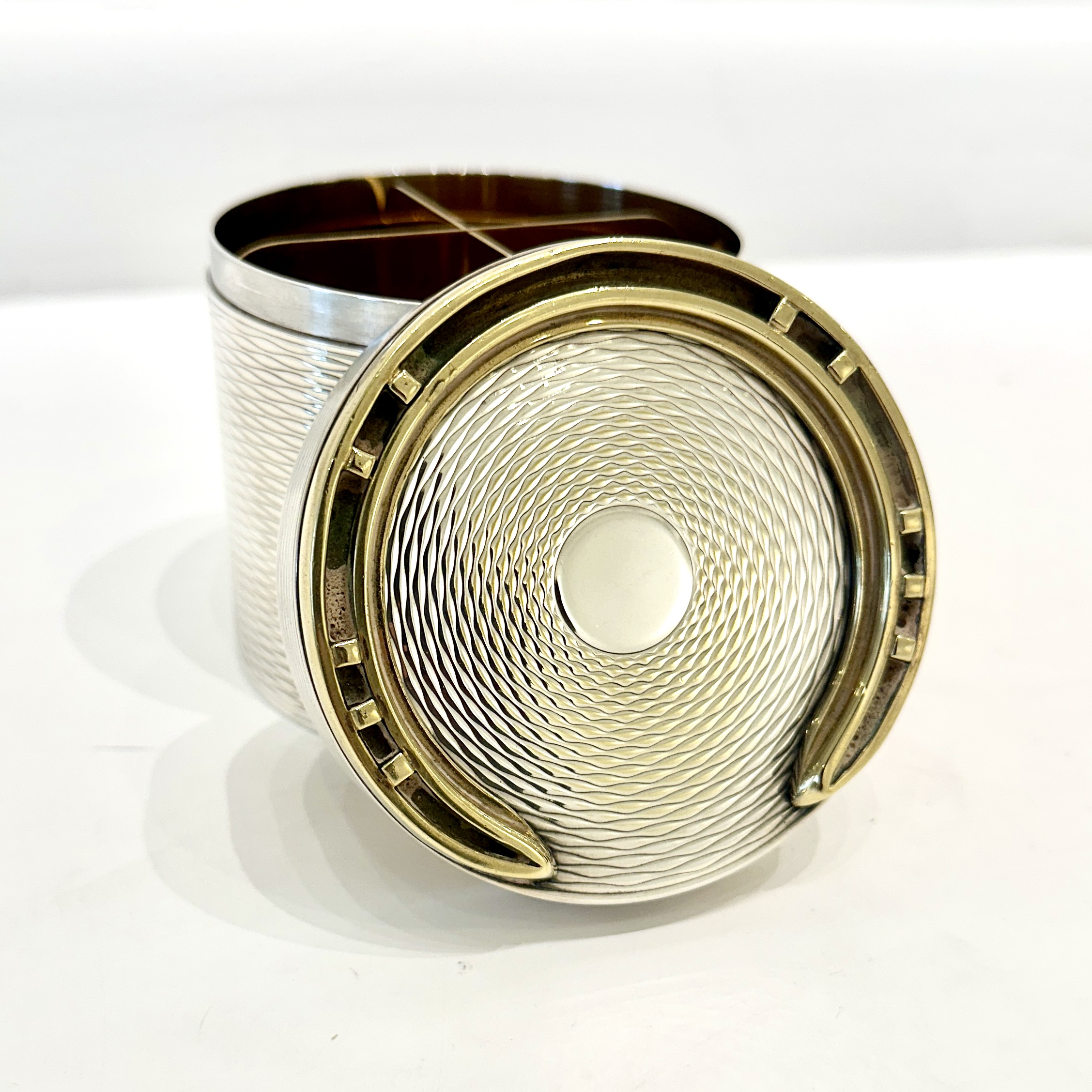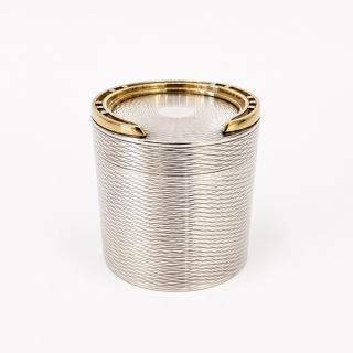 Hermes silver-plated large cylindrical box with brass horseshoe decoration on the lid. Exterior in textured design with a removable insert and gilt interior. Crafted by Ravinet d'Enfert for Hermes. Signed “Hermes” underneath. France 1960’s H: 3.75 D:3.5 inches