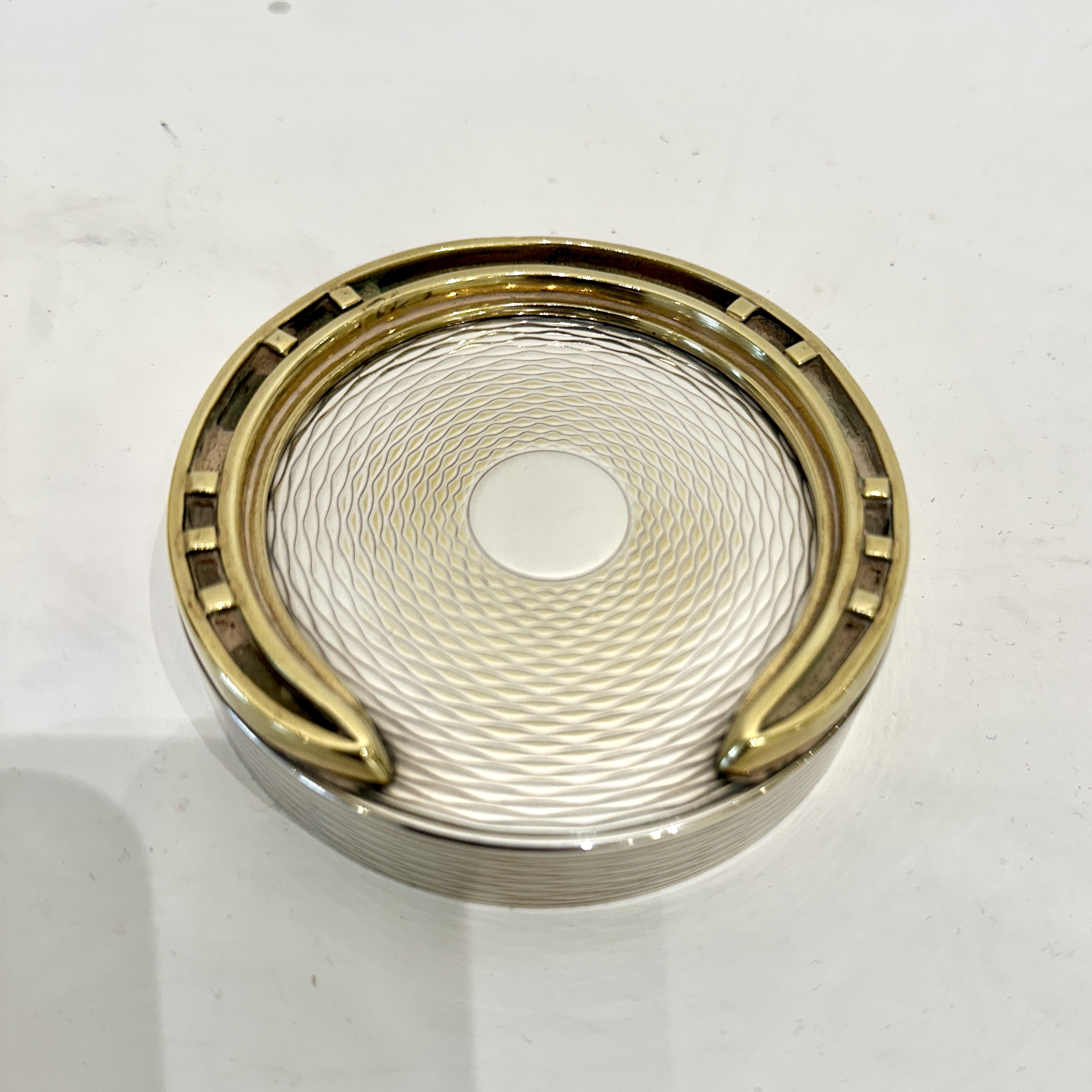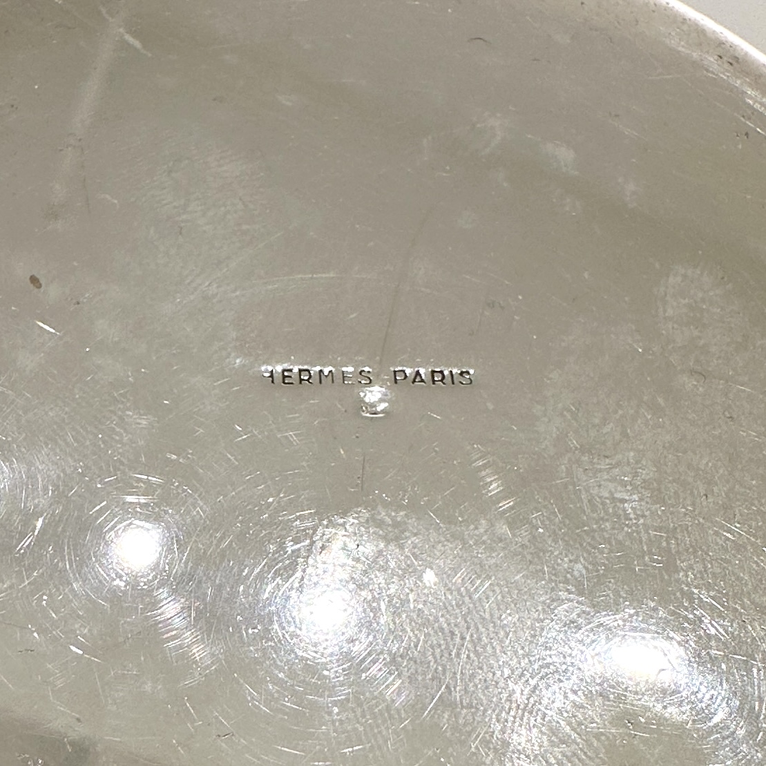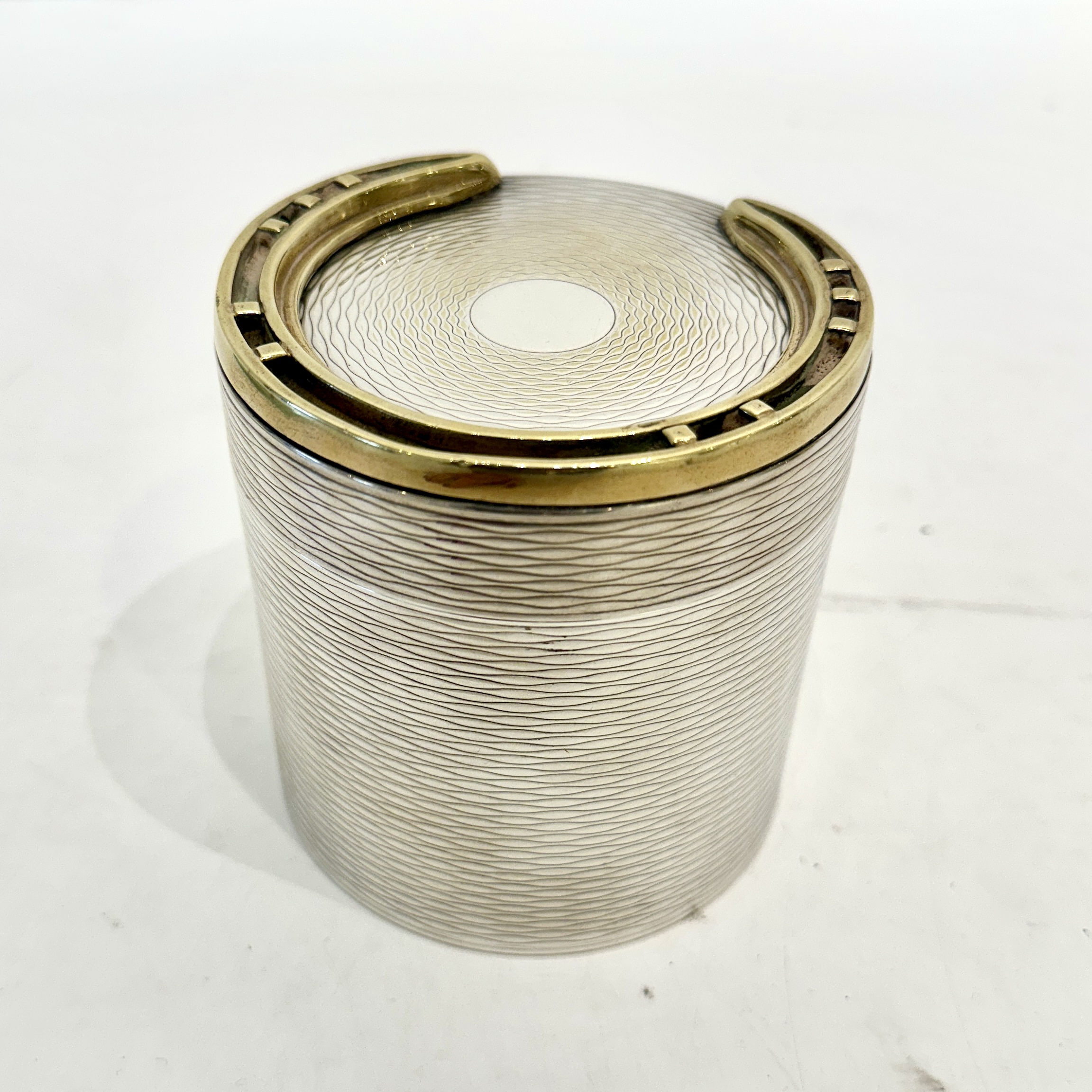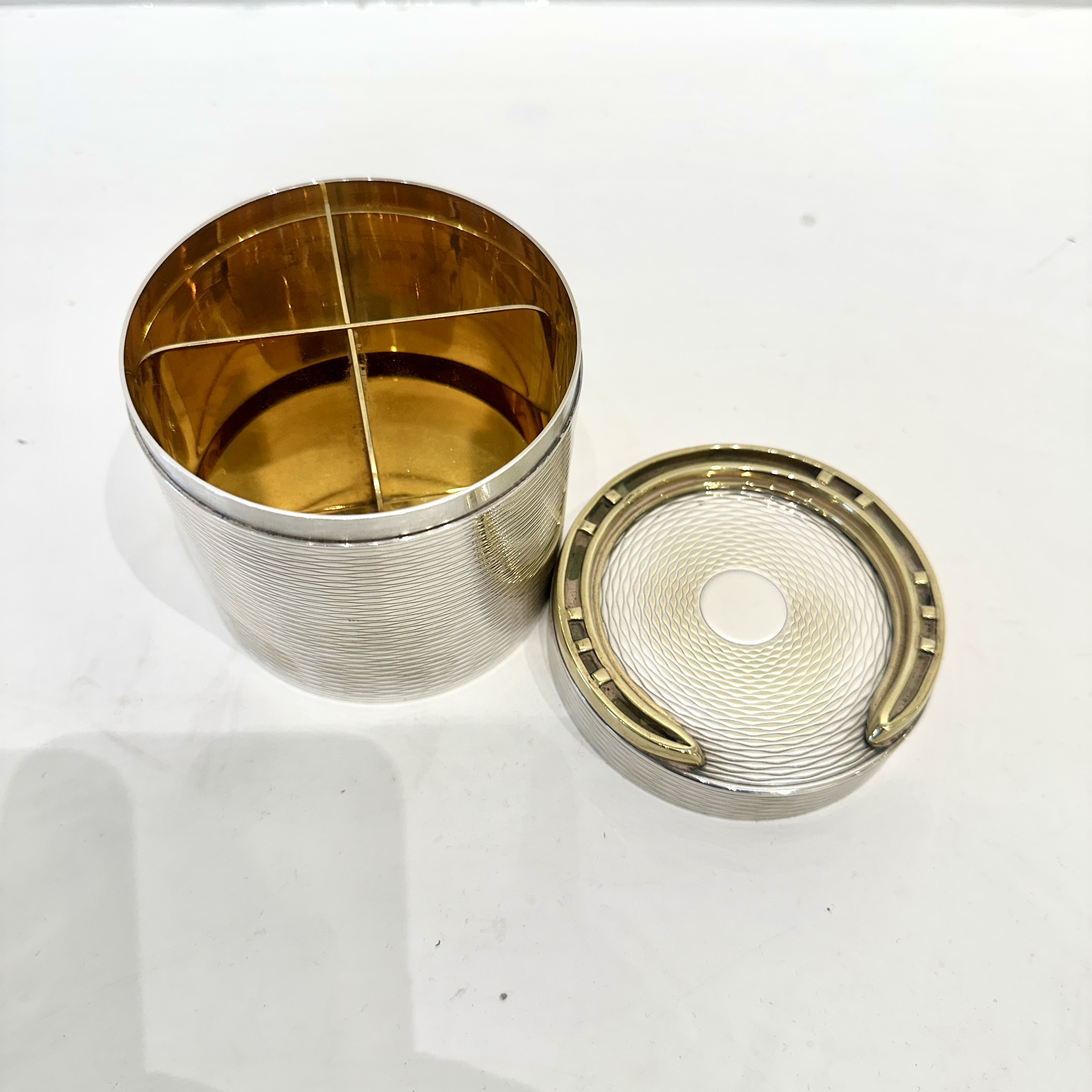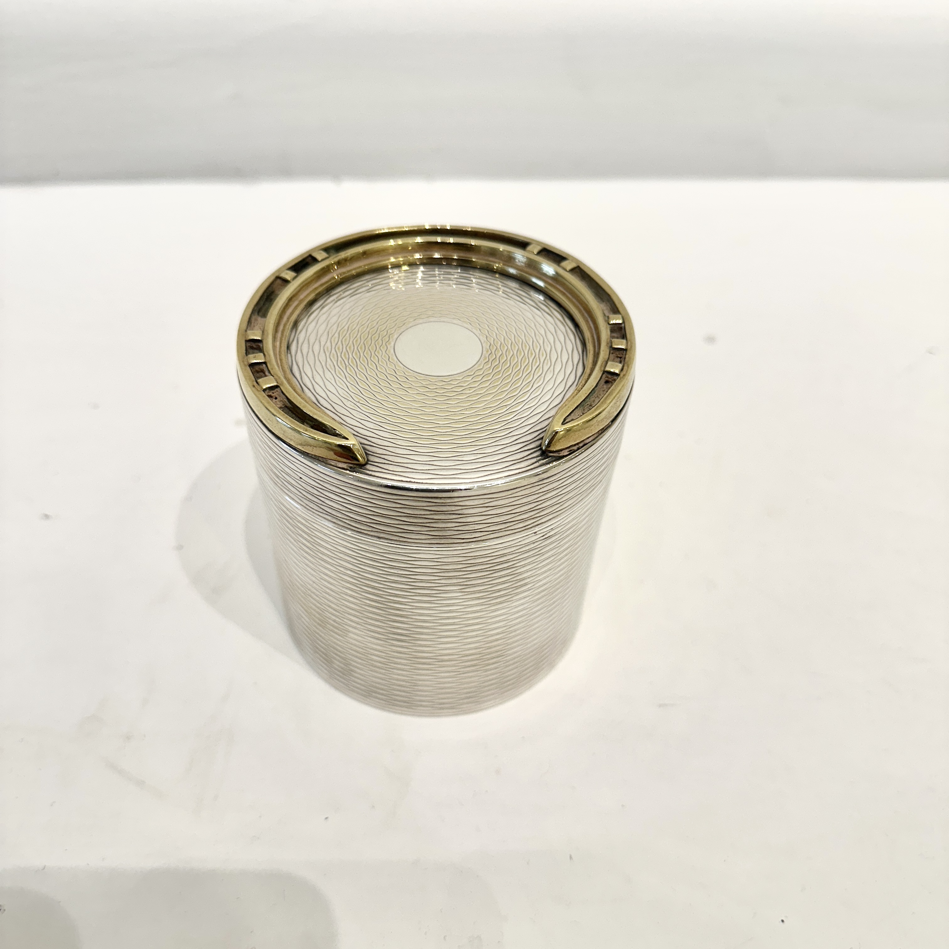 Hermes silver-plated large cylindrical box with brass horseshoe decoration on the lid. Exterior in textured design with a removable insert and gilt interior. Crafted by Ravinet d'Enfert for Hermes. Signed “Hermes” underneath. France 1960’s H: 3.75 D:3.5 inches