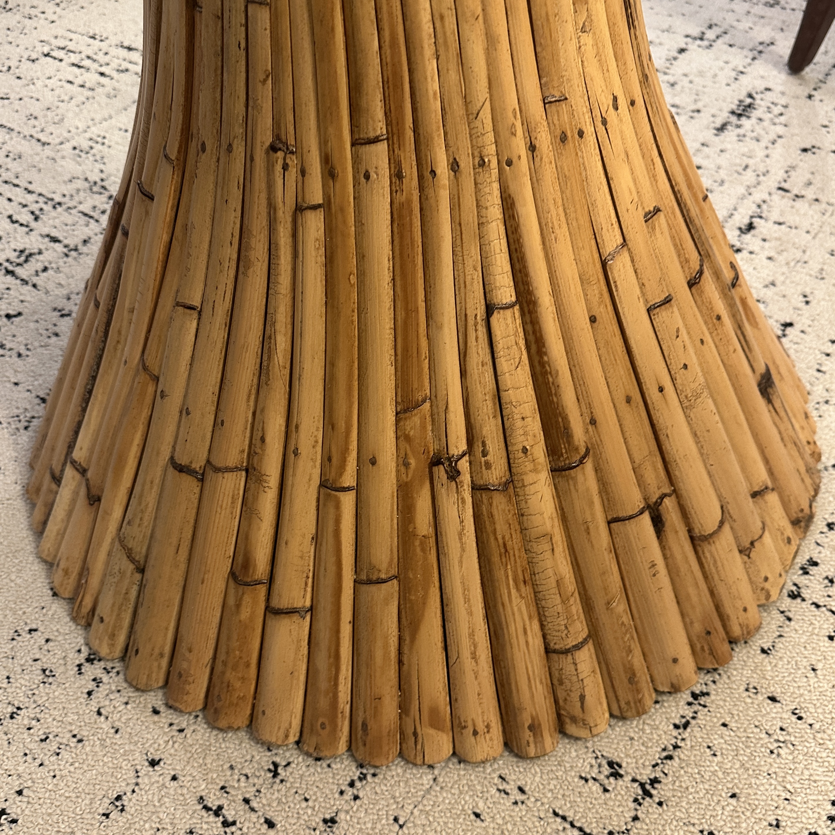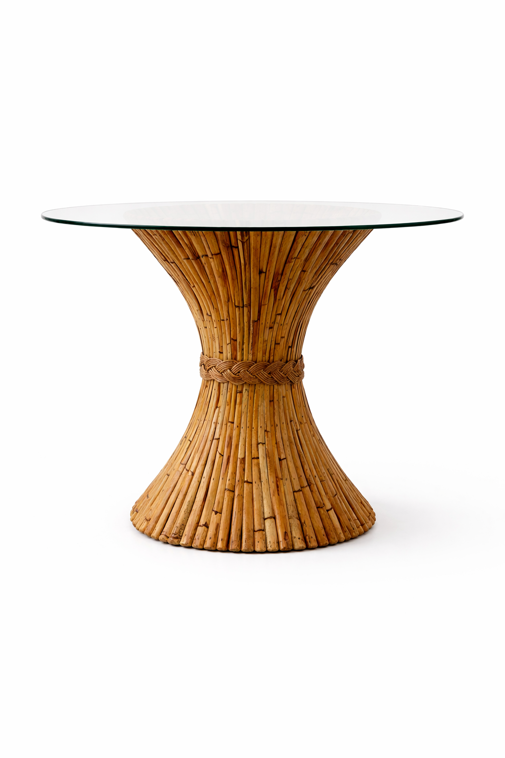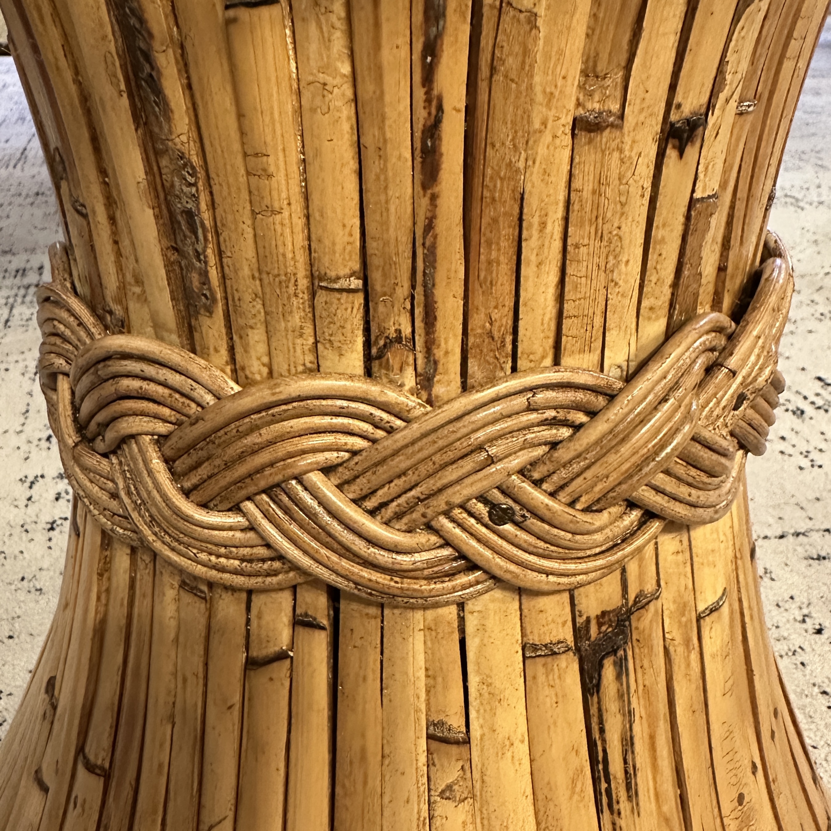 Rattan and Bamboo “Sheaf of Wheat” Center Table by McGuire. Vintage Modern design organic form sculptural table. Model BA-16 creates an hourglass silhouette from natural bamboo and rattan. John and Elenor McGuire produced this series during the 1970s. Bundled split bamboo bound with a woven rattan detail, fitted with a contemporary 34" glass top.