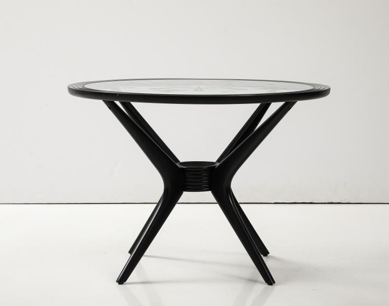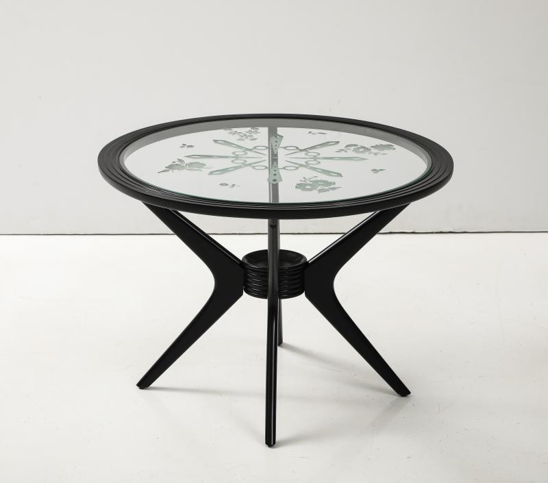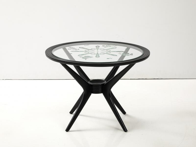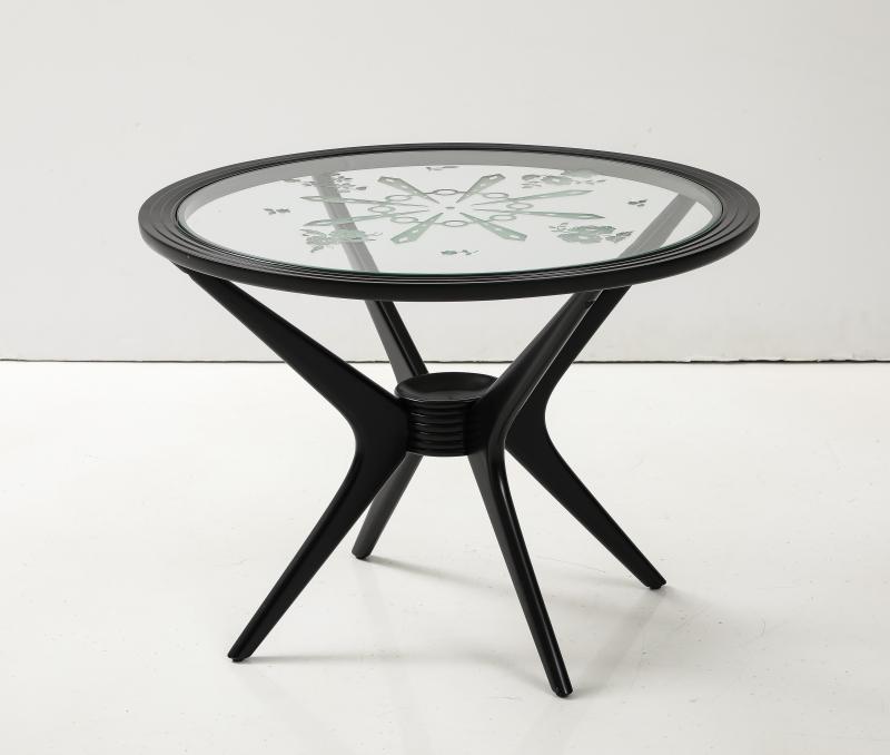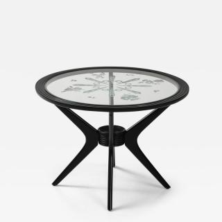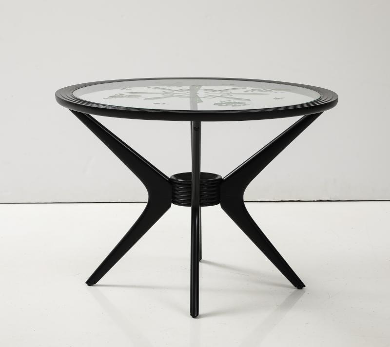 Midcentury Italian side table. 1950s. Ebonized fruitwood with original etched glass top.