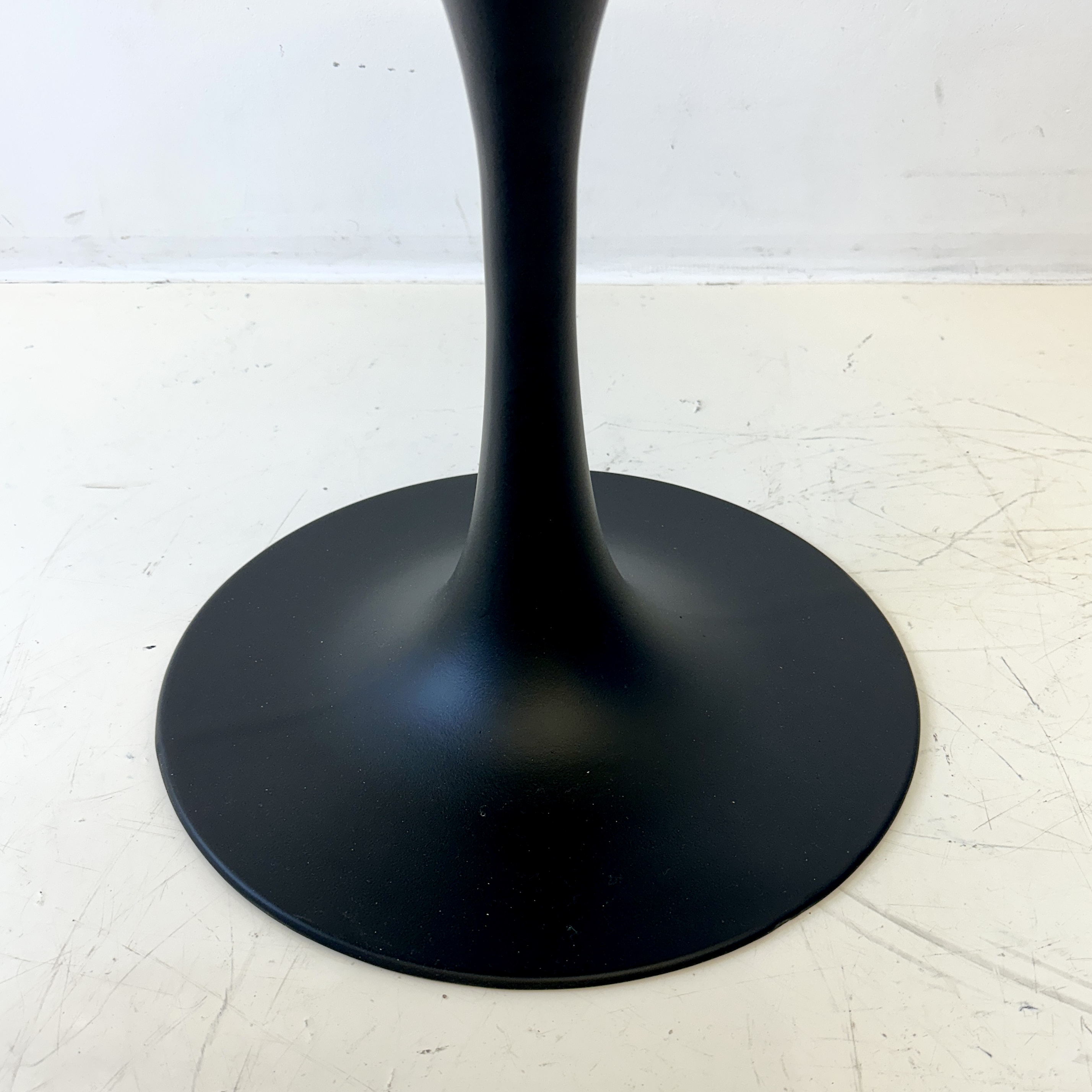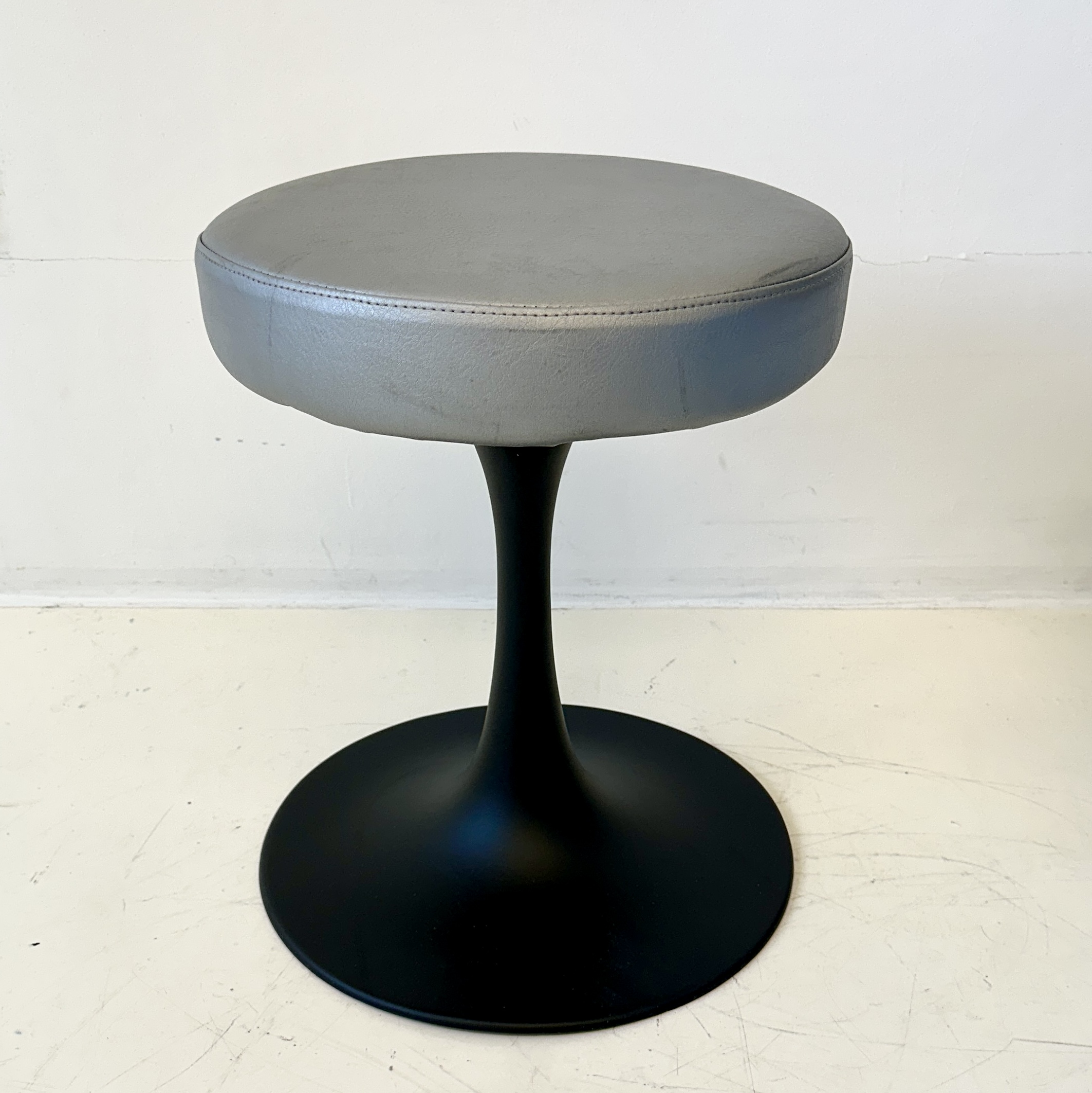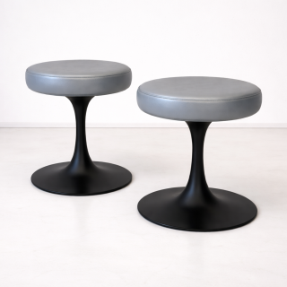 Mid-century modern tulip-base stools in the spirit of Eero Saarinen’s iconic 1960s designs. By Cre Rossi Brevete, Manufactured in France. Black powder-coated aluminum finish.