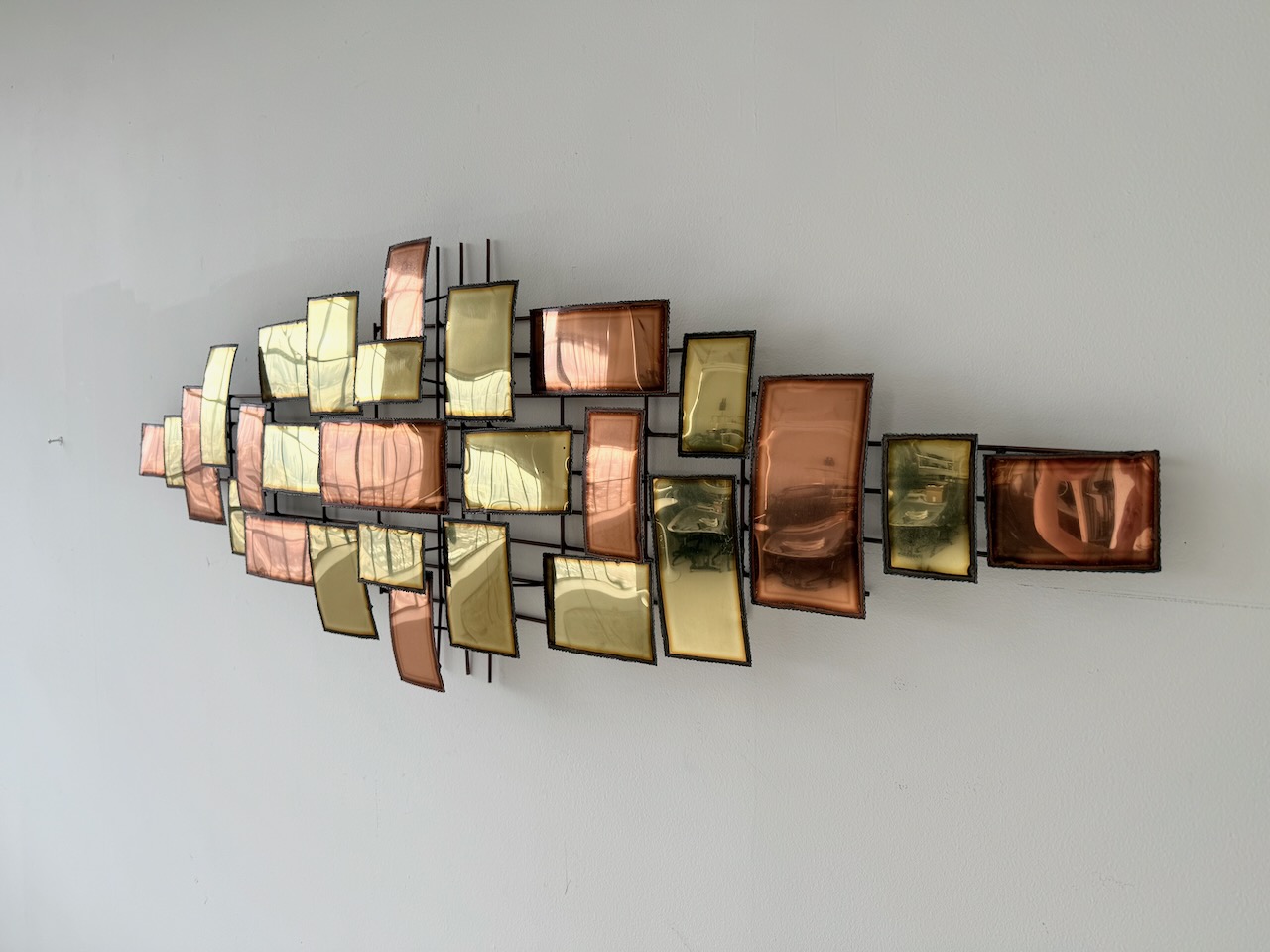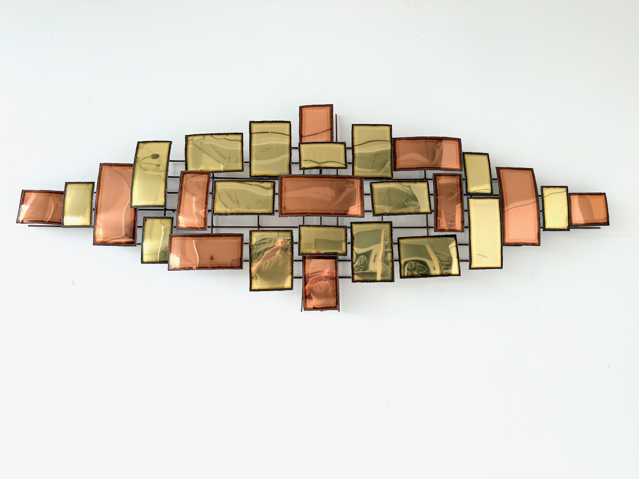 Abstract Brutalist Vintage Mid-Century Modern Wall Art, Copper and Brass, in the style of Mario Jason or Curtis Jeré. Geometric design arrangement of hand-cut brass and copper rectangles and squares, brutalist-inspired.