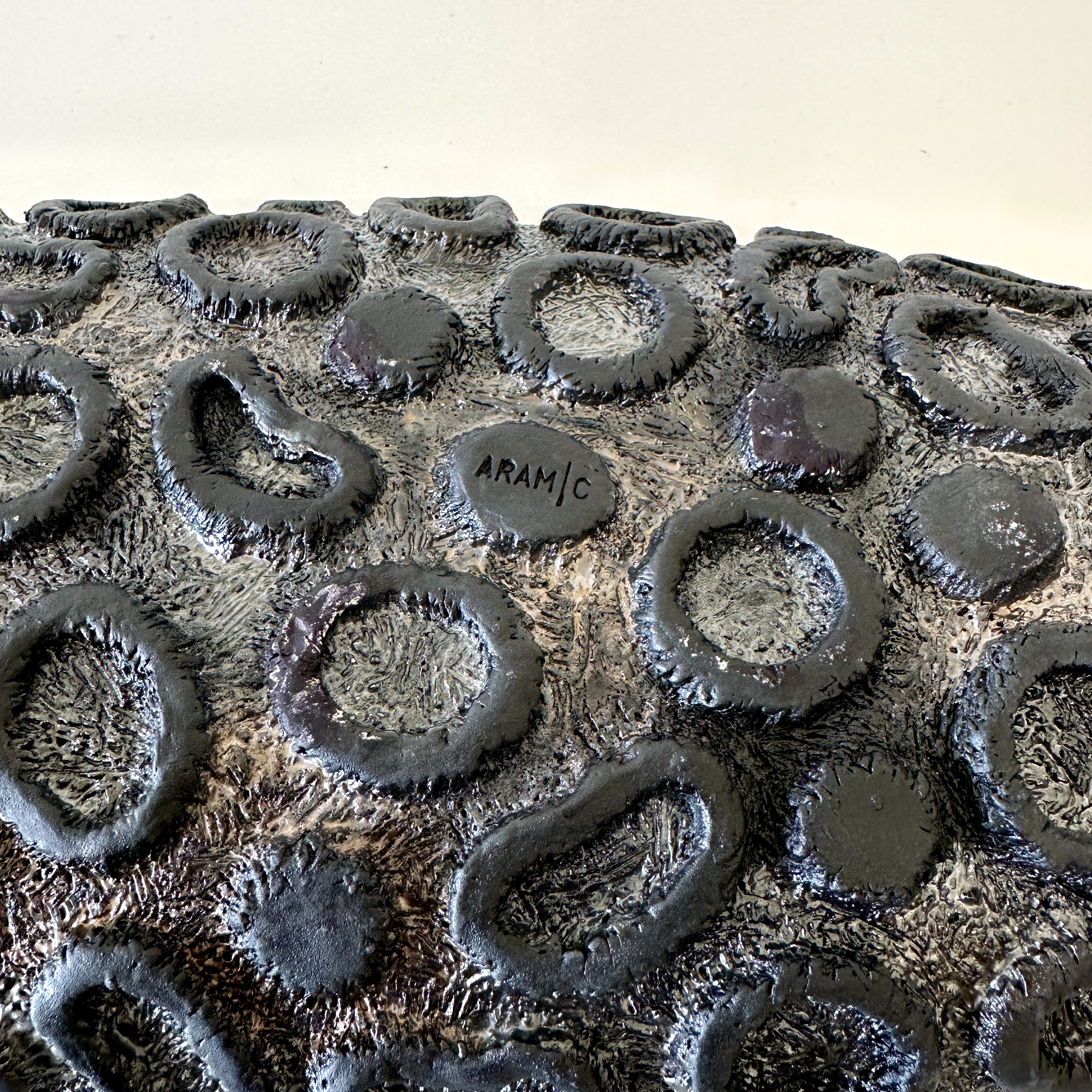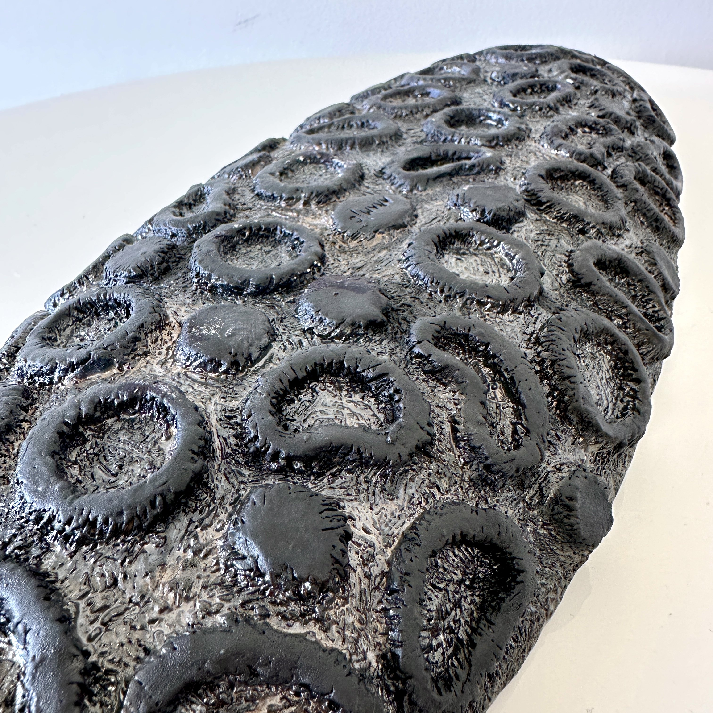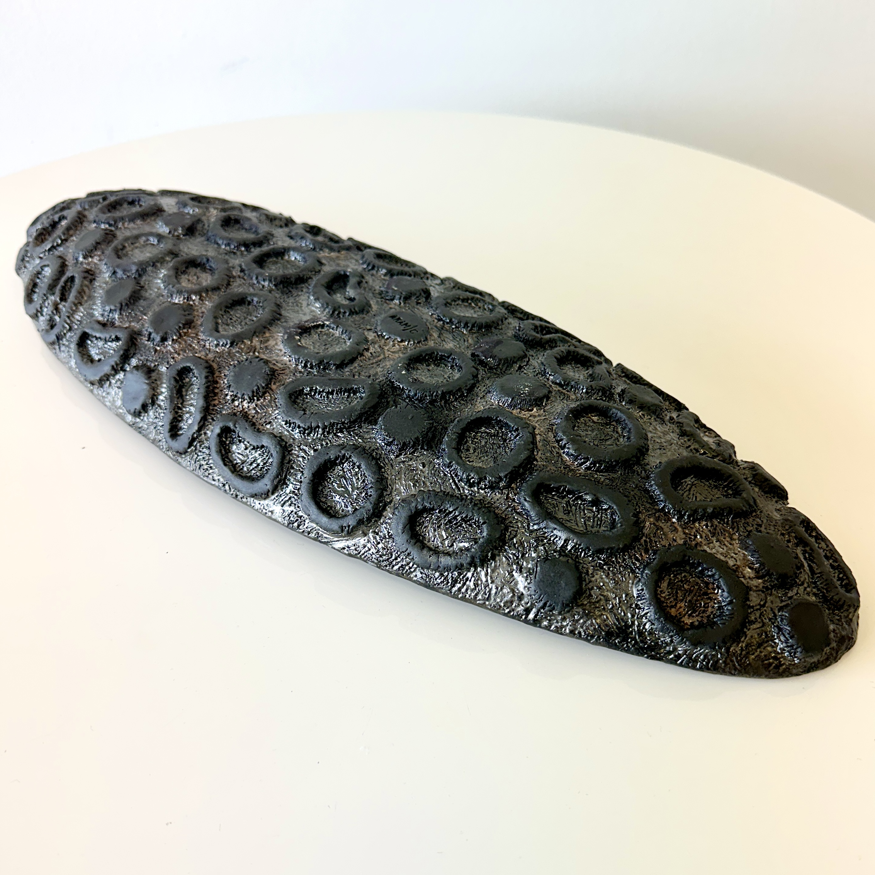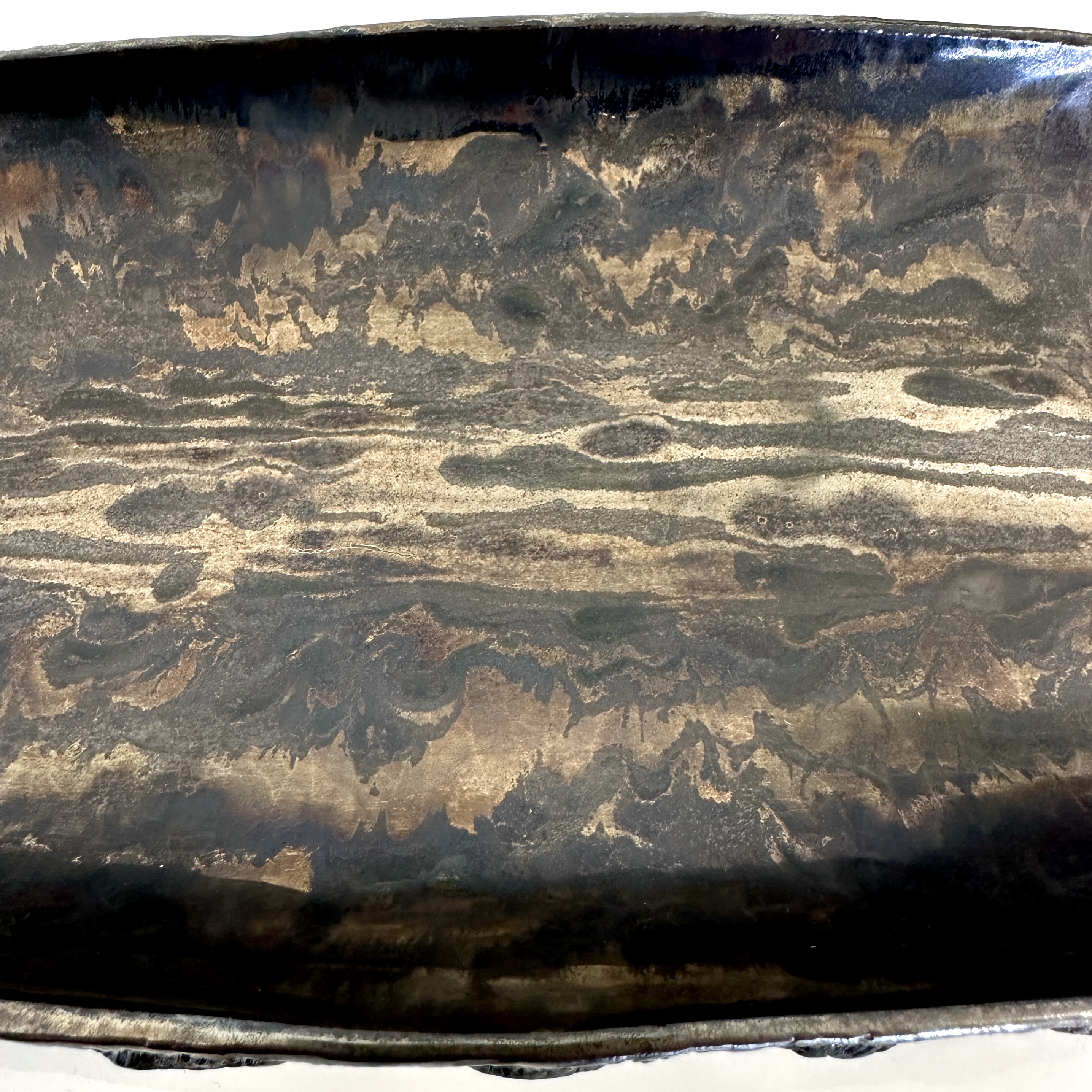 "Oblong centerpiece in a gold and silver glaze with a ring-patterned and textured decorative underside. For decorative use only.