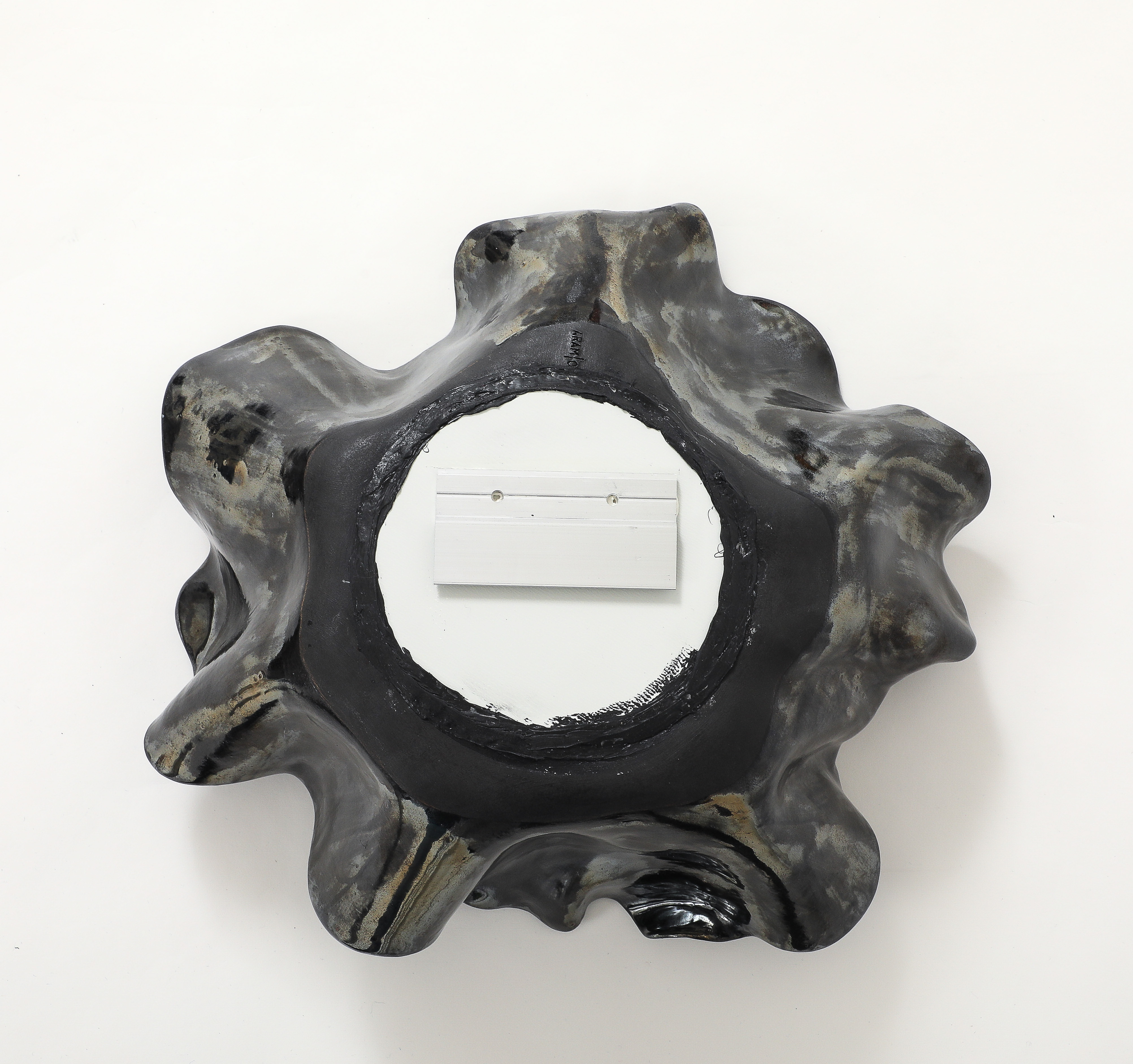 Organic form wall mirror. Ceramic glazed frame with black-chrome metallic textured finish. Made By Aram C.