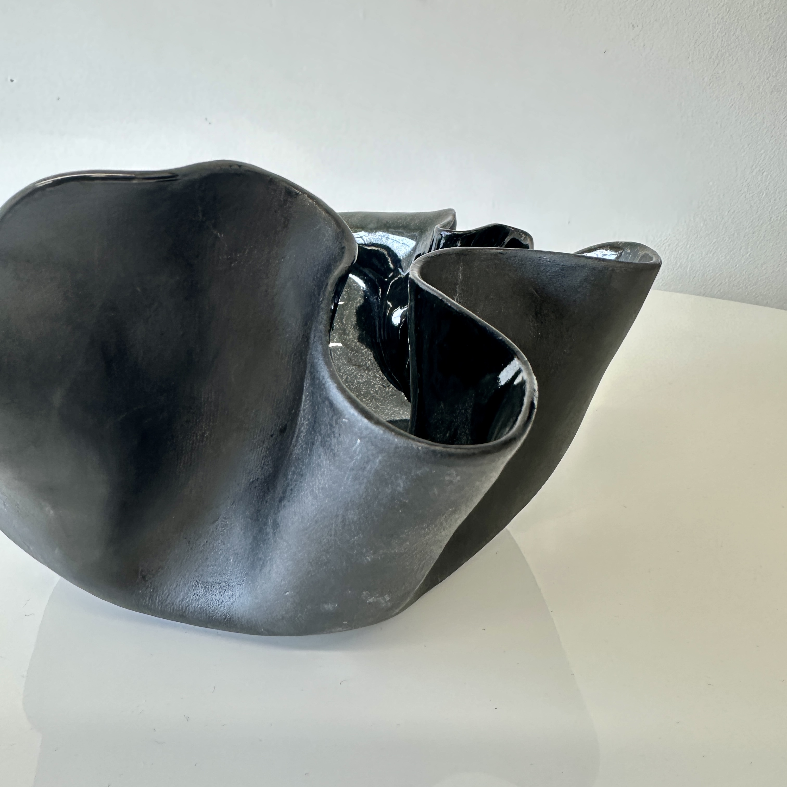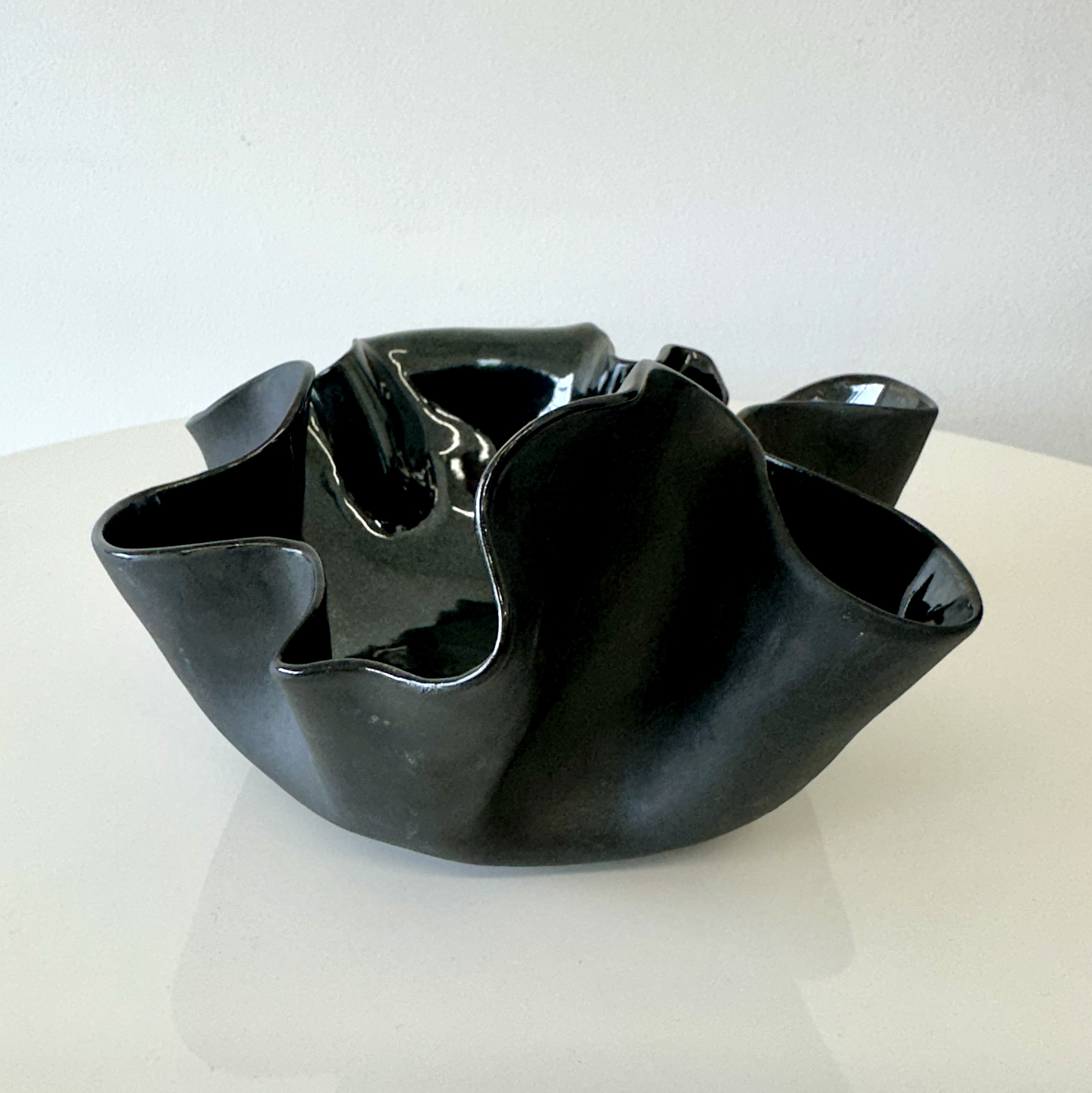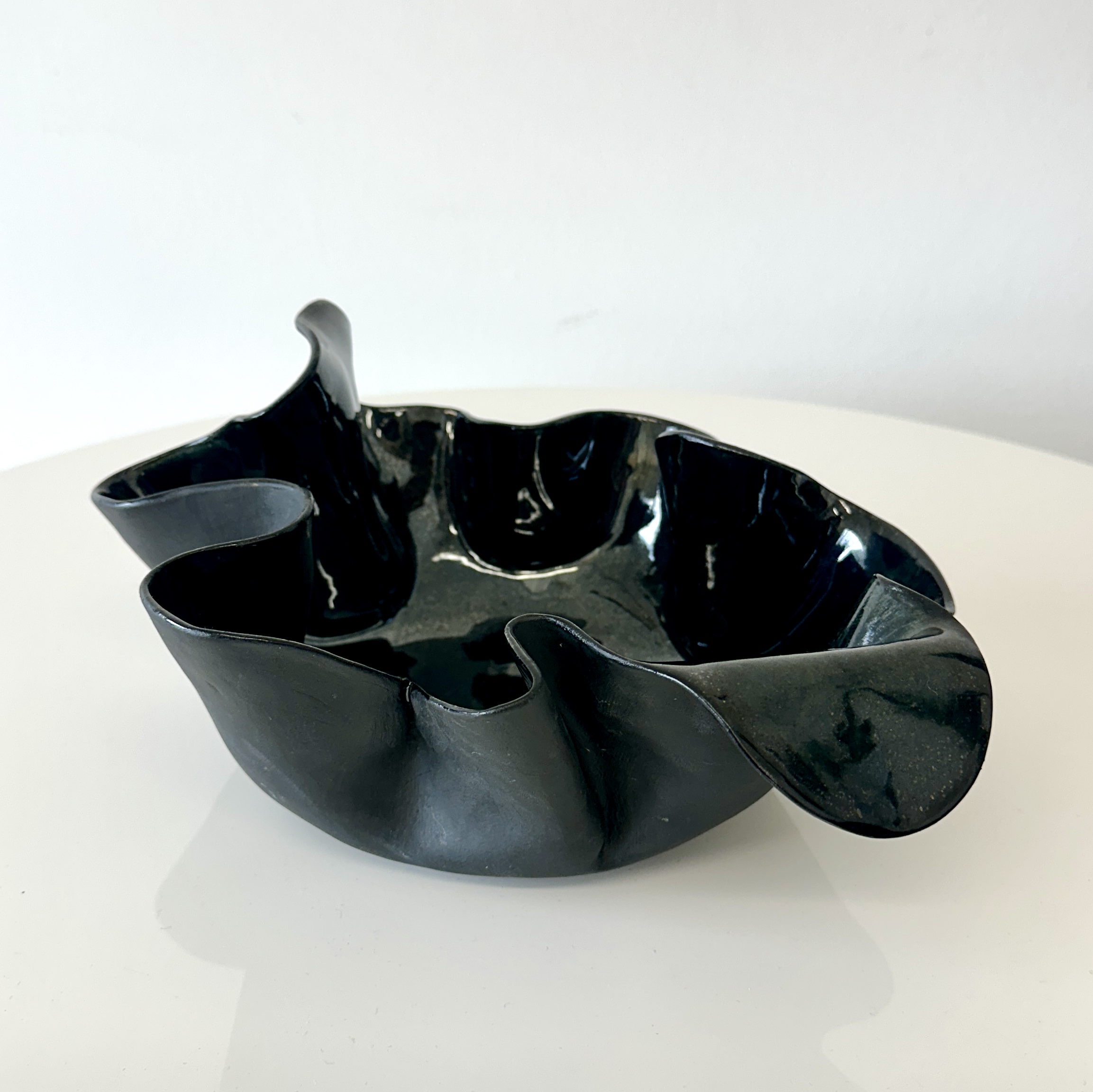 Organic free-form ruffled-edge bowl glazed in a deep blue-black gloss finish. For decorative use only.