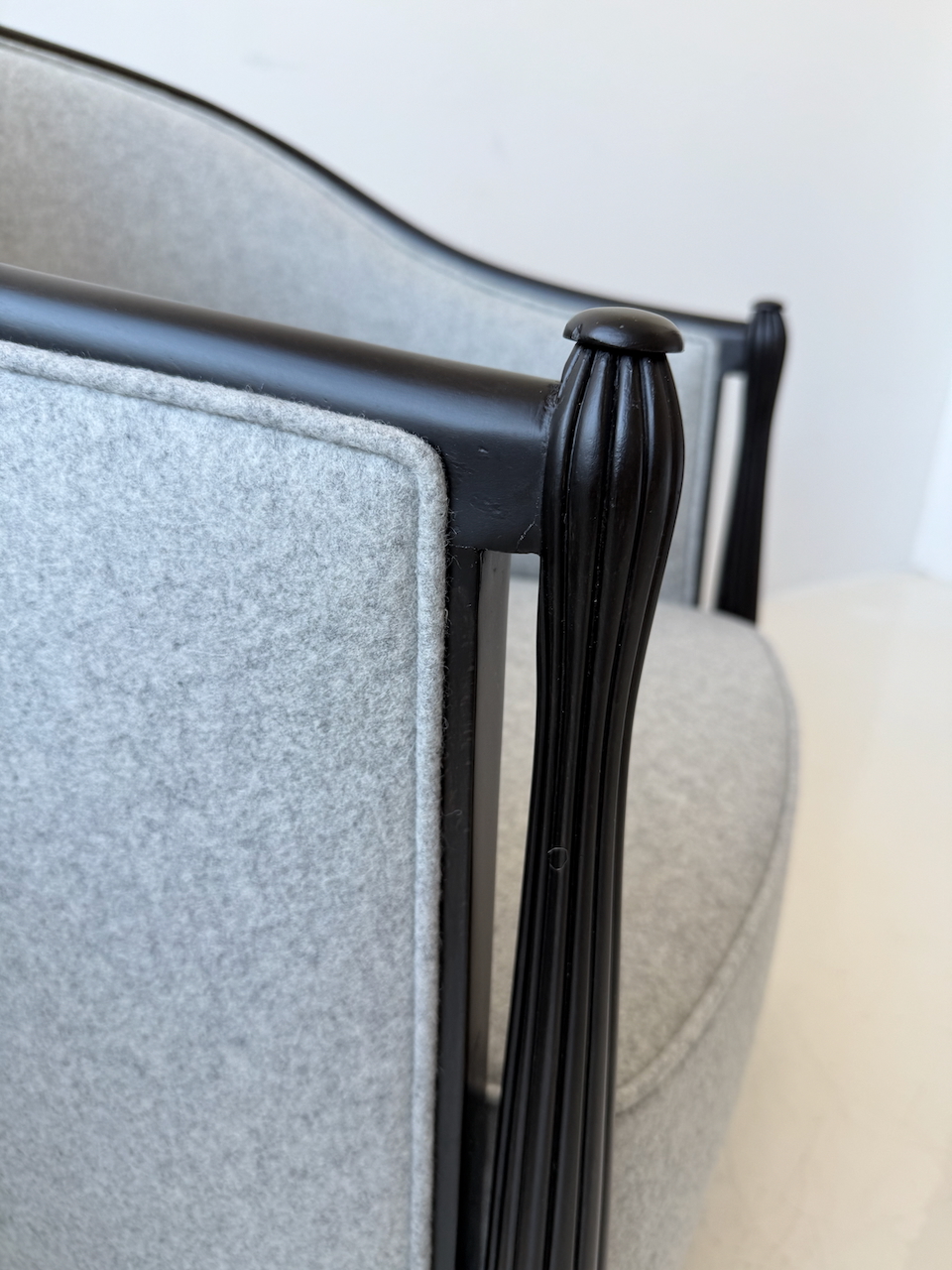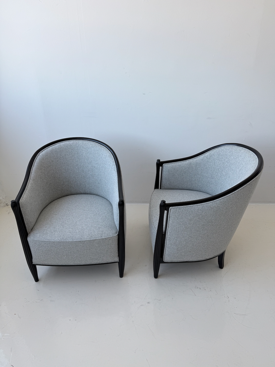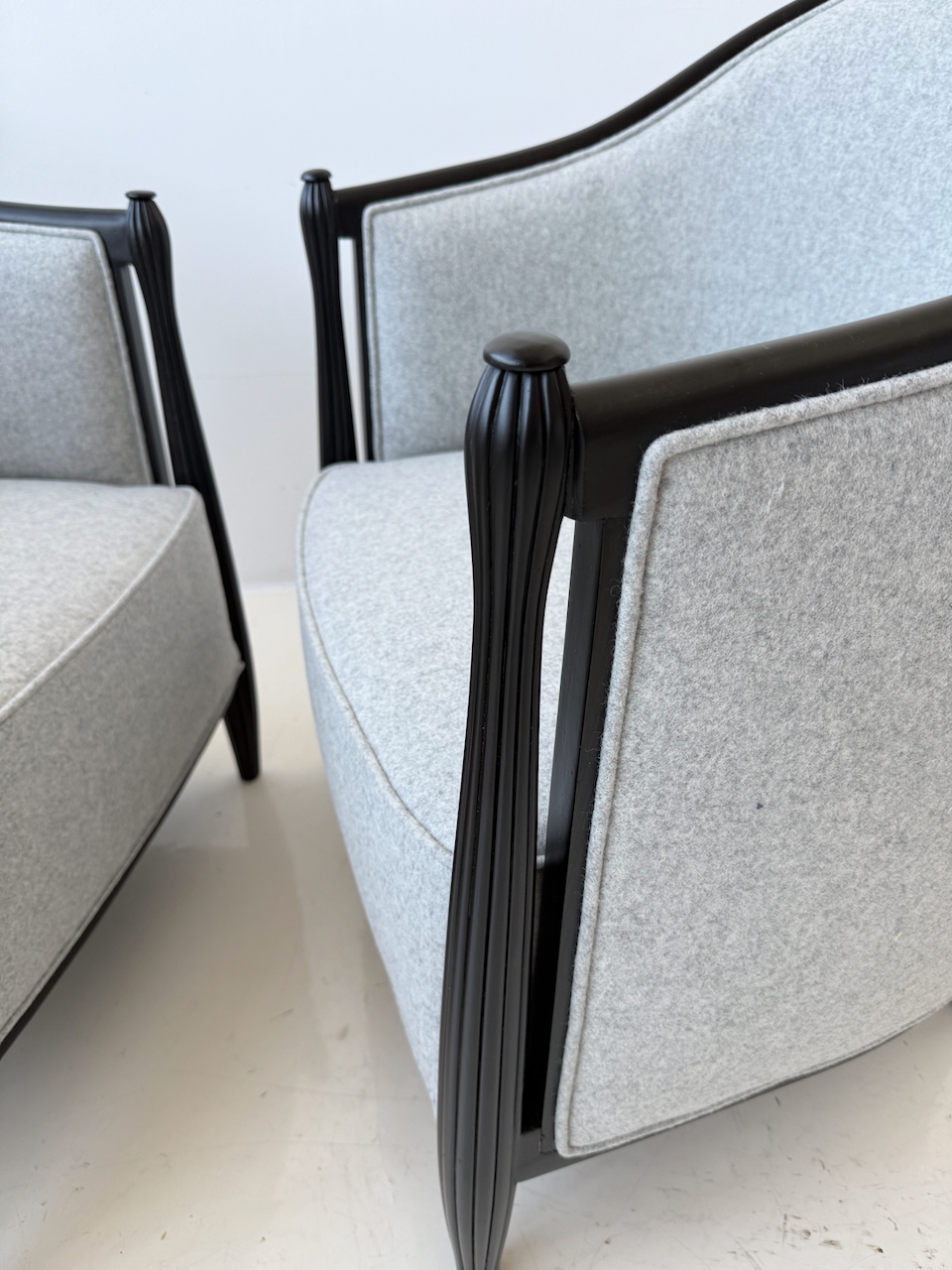 A pair of Art Deco bergeres ebonized frame with wool grey flannel upholstery. Fluted front detail and a tall back. France 1930’s