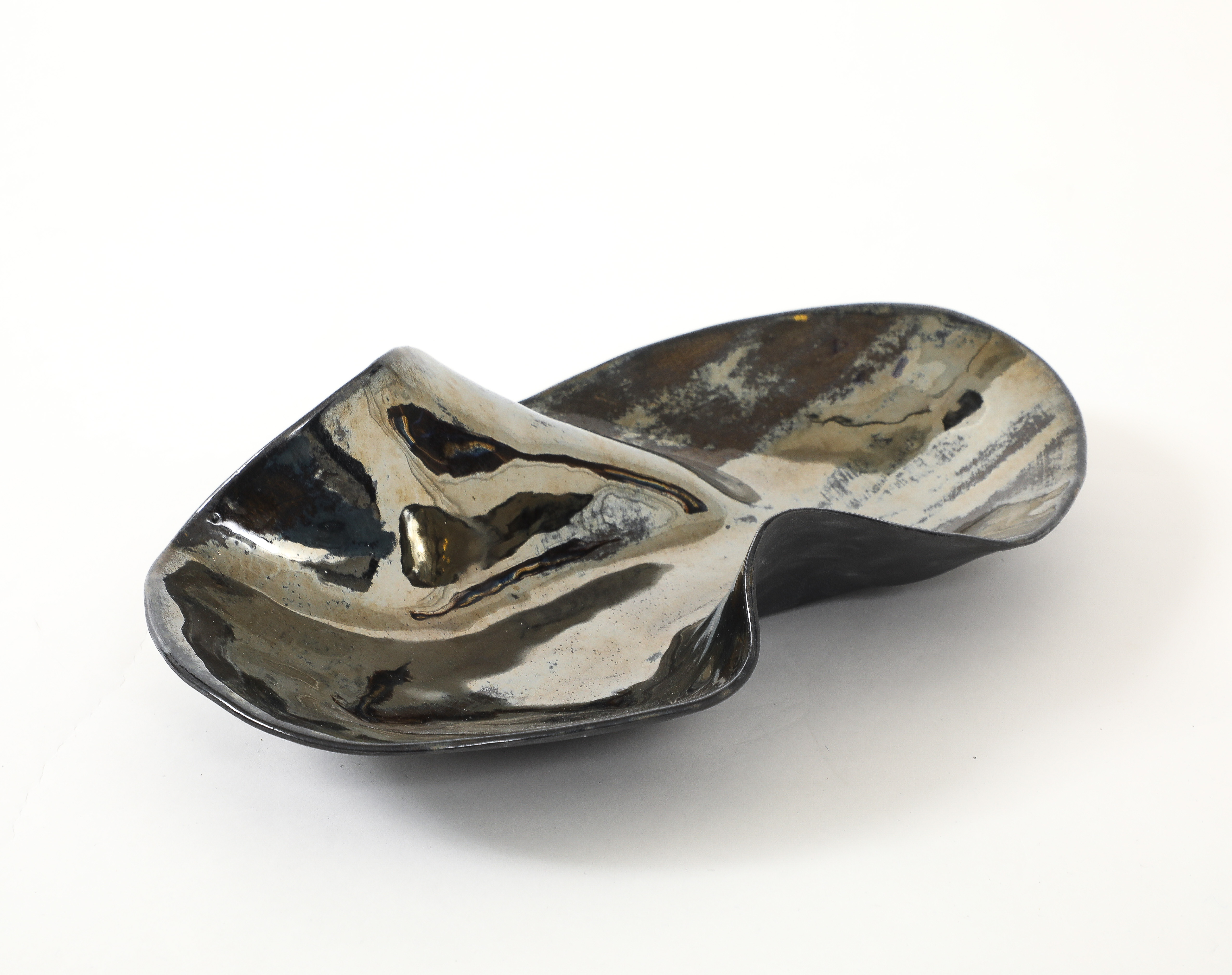 Pair of decorative free-form wave platters in a highly-reflective black-chrome platinum finish.Made By Aram C. Signed "Aram C"