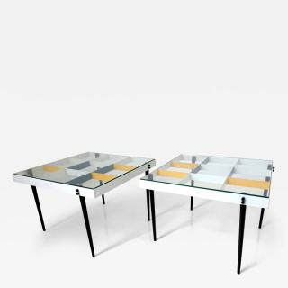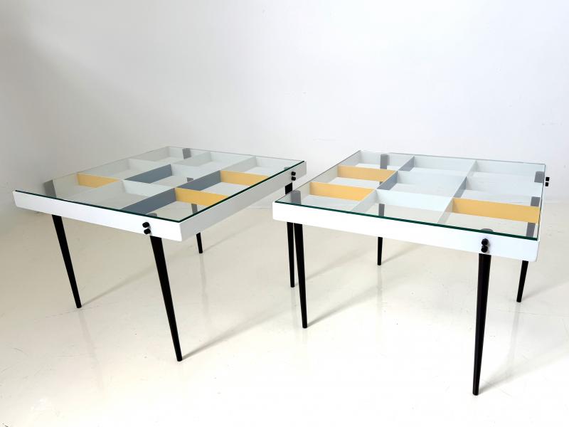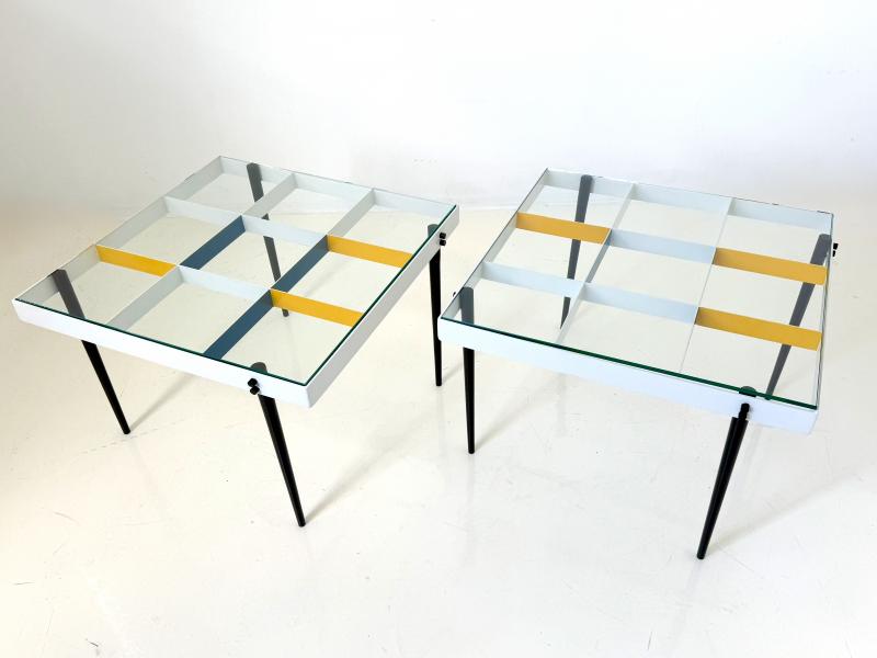 This pair of Planchart tables, executed with diamond-patterned steel frames and hand painted using primary colors, are icons of Gio Ponti's "Arlecchino design" inspired by the Italian Arlecchino (Harlequin) character. These tables, which have been meticulously restored to their original colors, reflect the fine hand crafted steel fabrication of the 1950s.