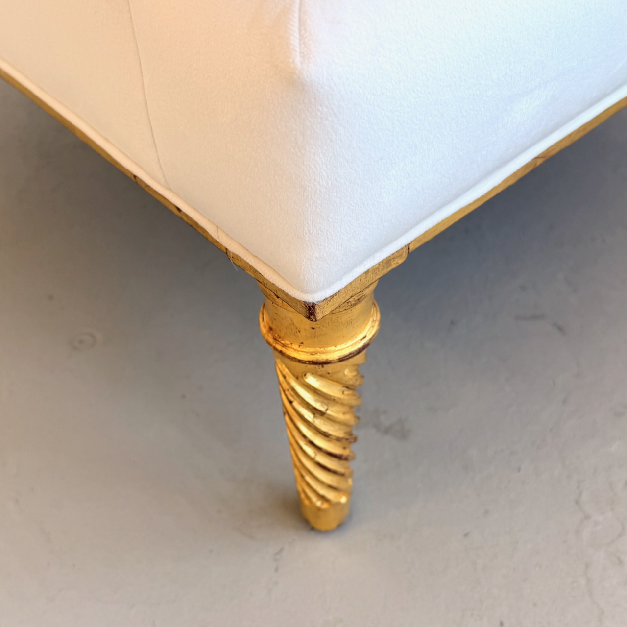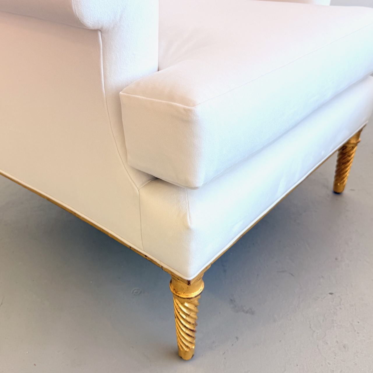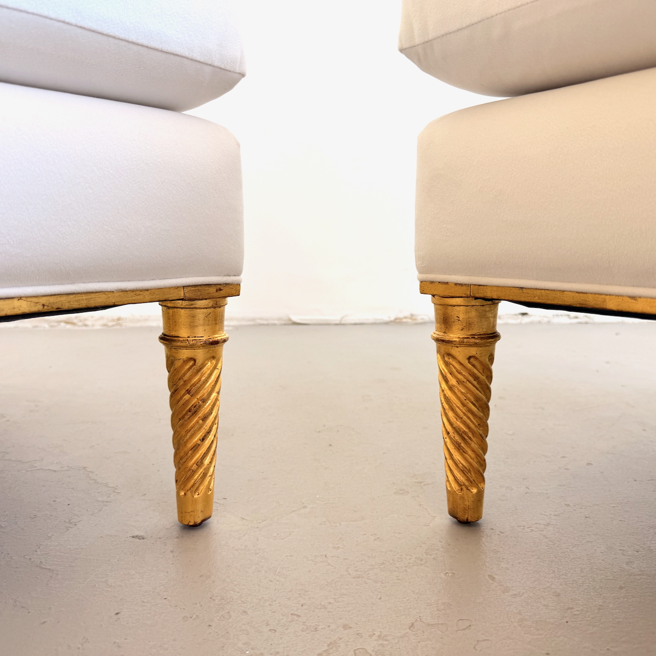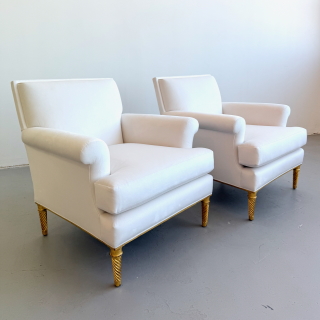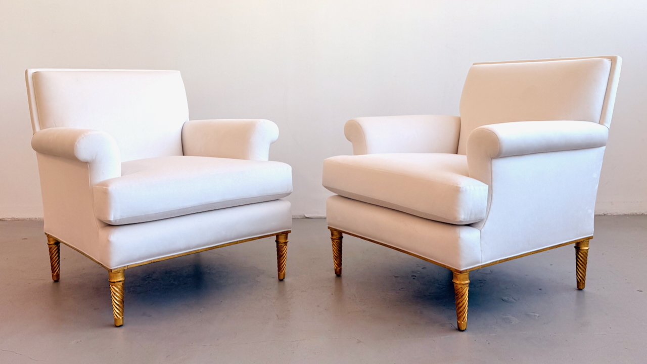 Pair of upholstered lounge chairs with gilded wood legs and base Attrb. Maison Carlhian, France 1930's. Restored and reupholstered in a fine ivory velvet.