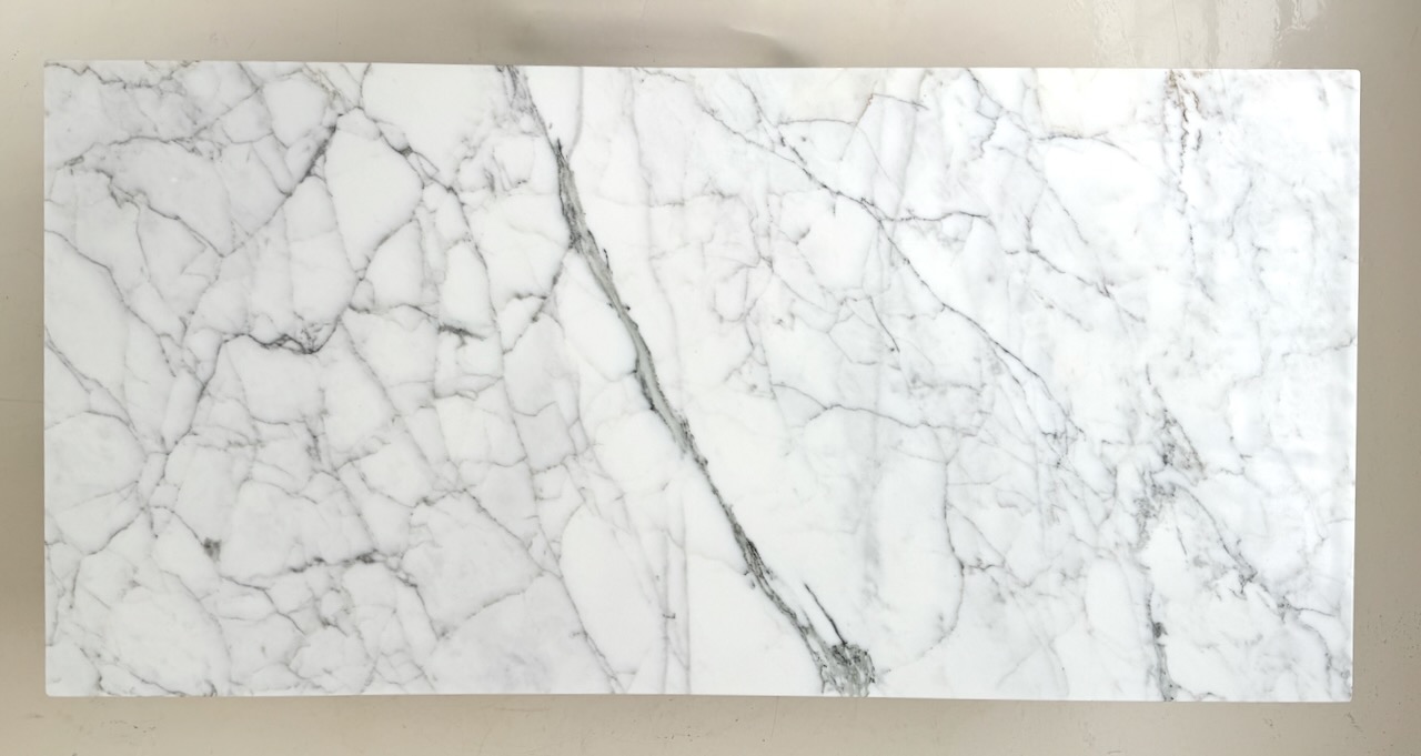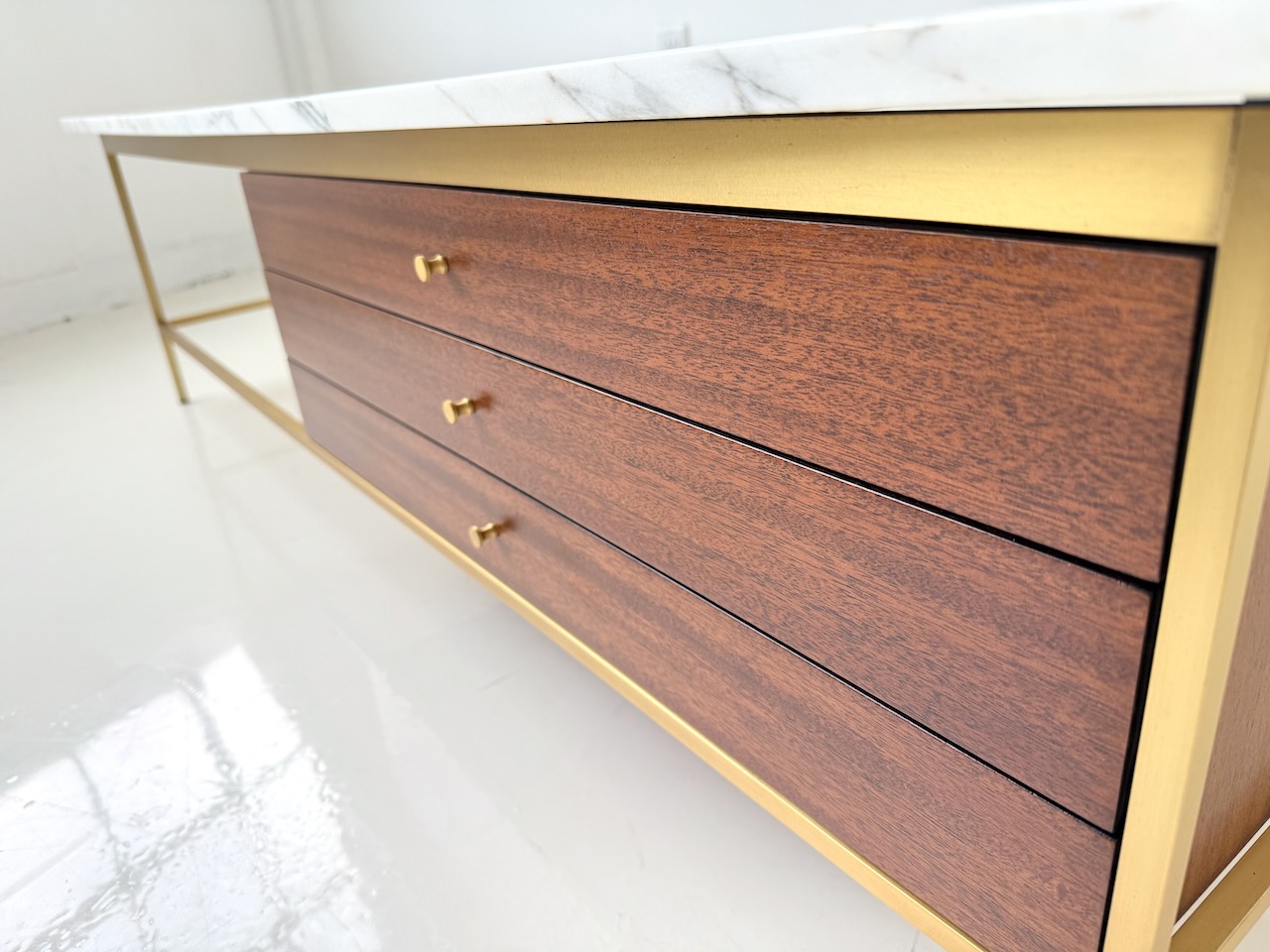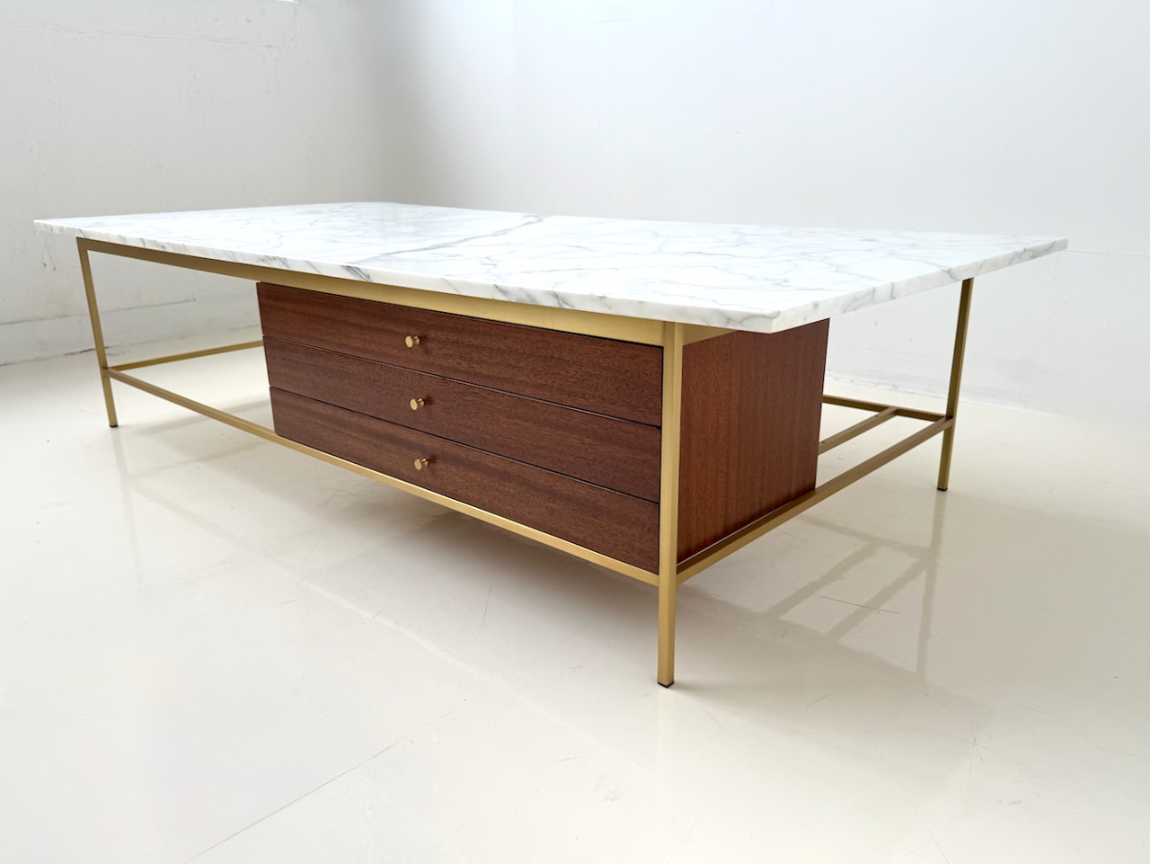 Mid century modern coffee table designed by Paul McCobb for Calvin’s Irwin Collection. Three mahogany drawers with polished brass frame. Original Carrera marble top. Fully restored. 66” wide. 32” deep. 16” tall. (brass base is 30"x56", drawers are 29.5 wide)