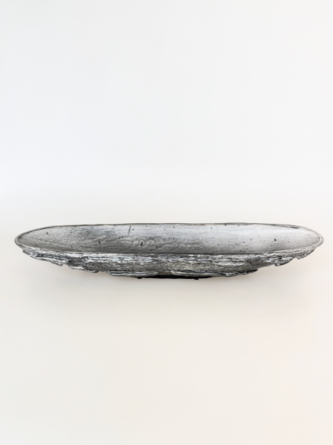 Textured and patterned oblong ceramic bowl in shades of gray and white. Made By Aram C. Signed "Aram C"