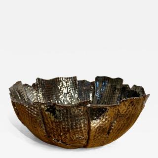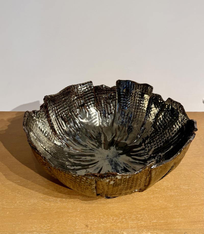 Waffle textured decorative bowl in a black-chrome metallic glaze. Made By Aram C. Stamped "Aram C".
